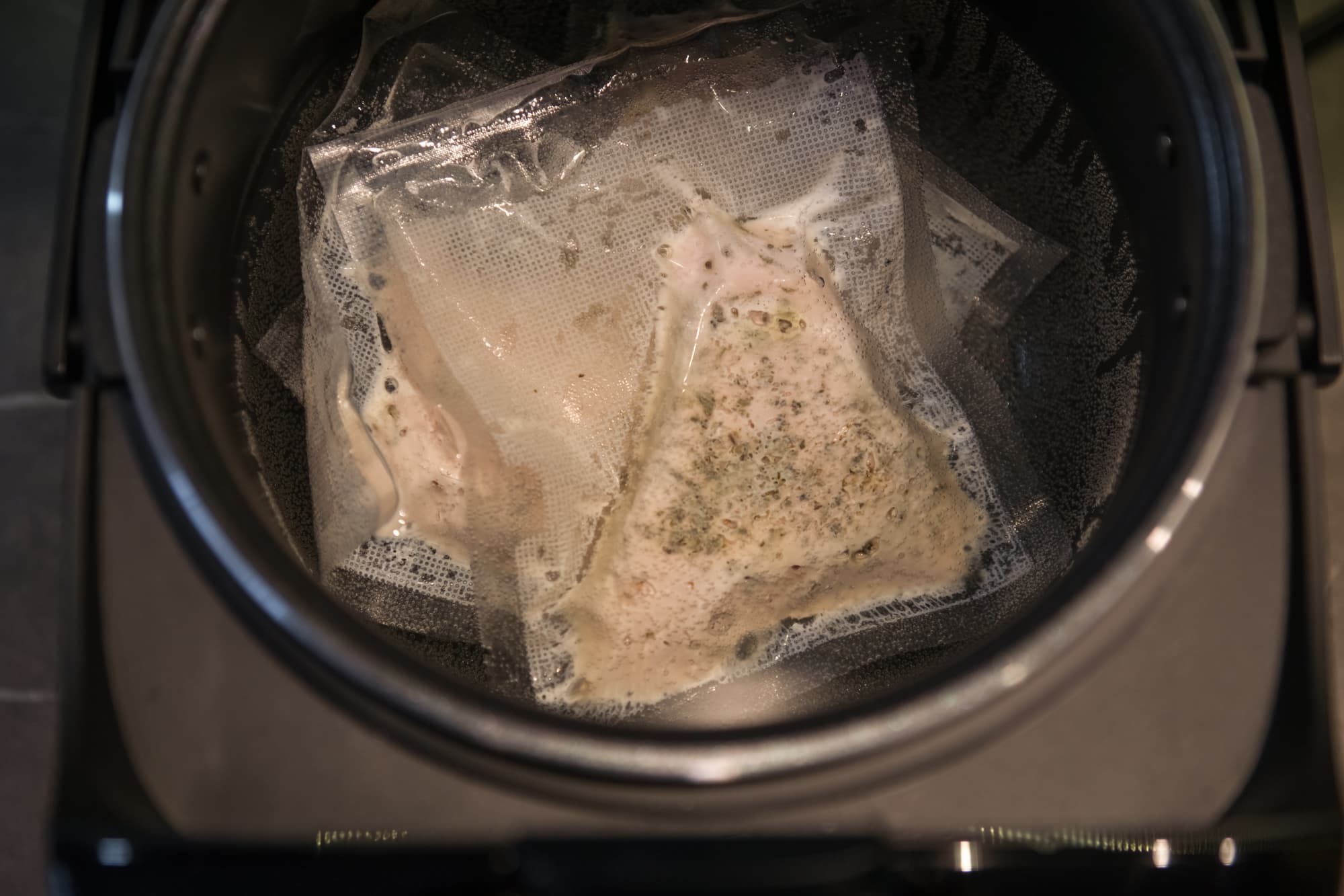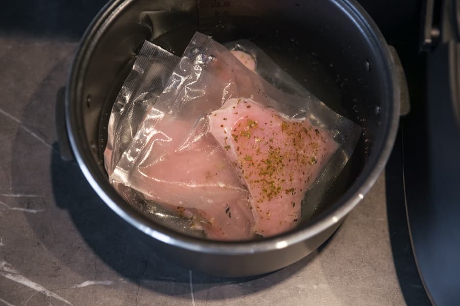 Программа Вакуум автоматически выставляет 63 °C на 3 часа. Мы посчитали температуру разумной и, ориентируясь на рекомендации из комплектной книги рецептов, изменили только время приготовления: наша птица готовилась 2 часа.
