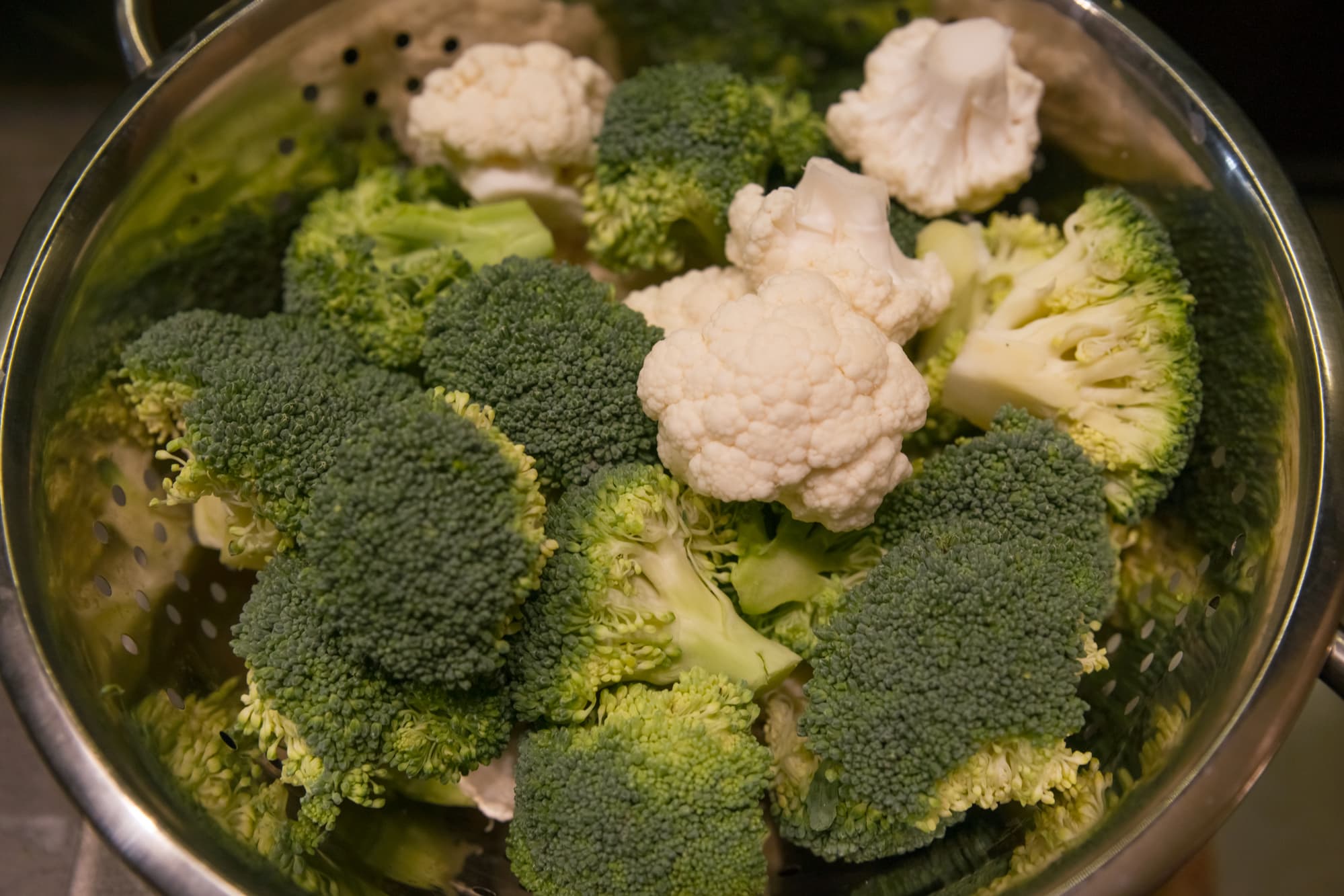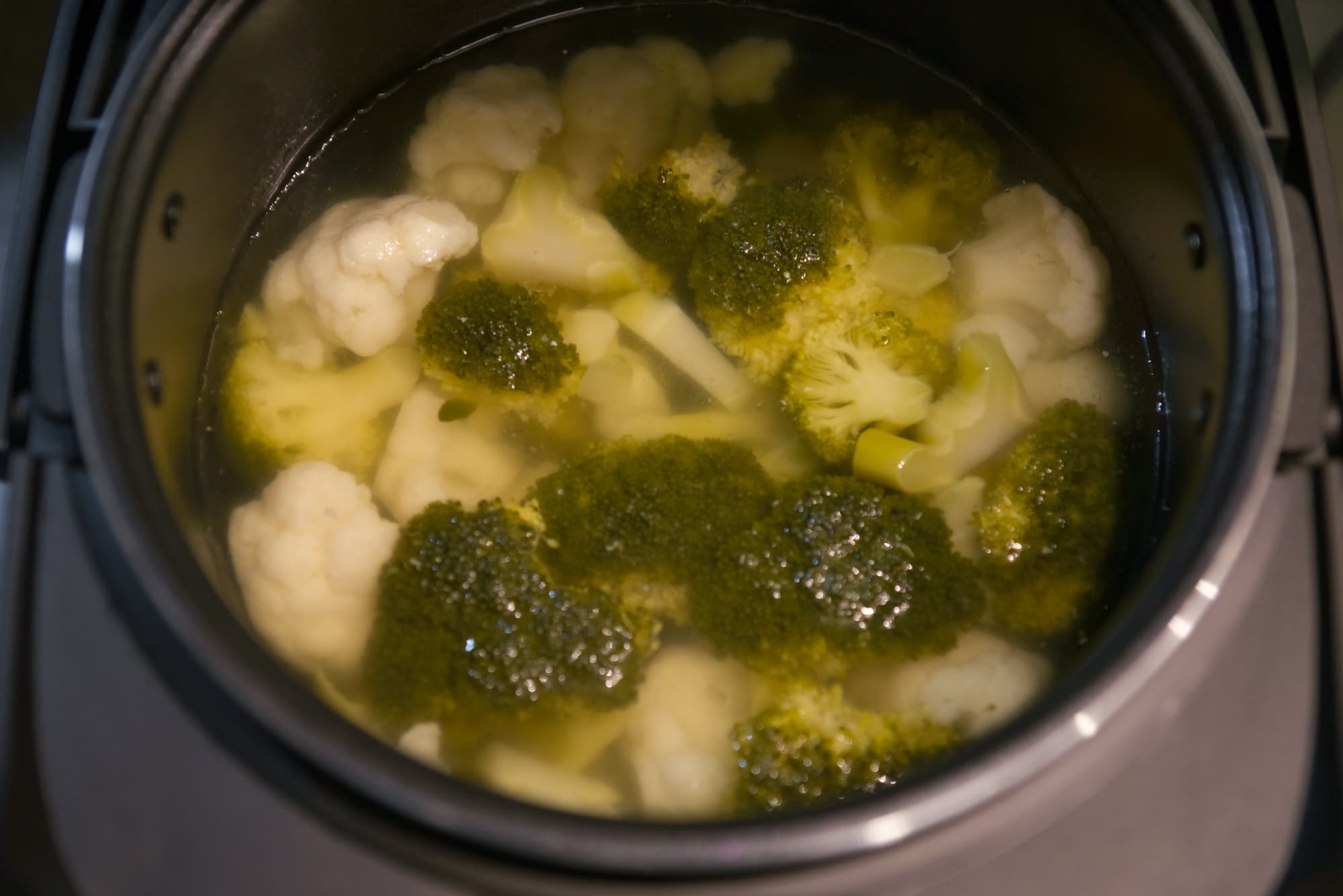 Нам, конечно, хотелось одновременно с бульоном сварить на его пару́ овощи, но весь объем подготовленных брокколи и цветной капусты в контейнер не влез.