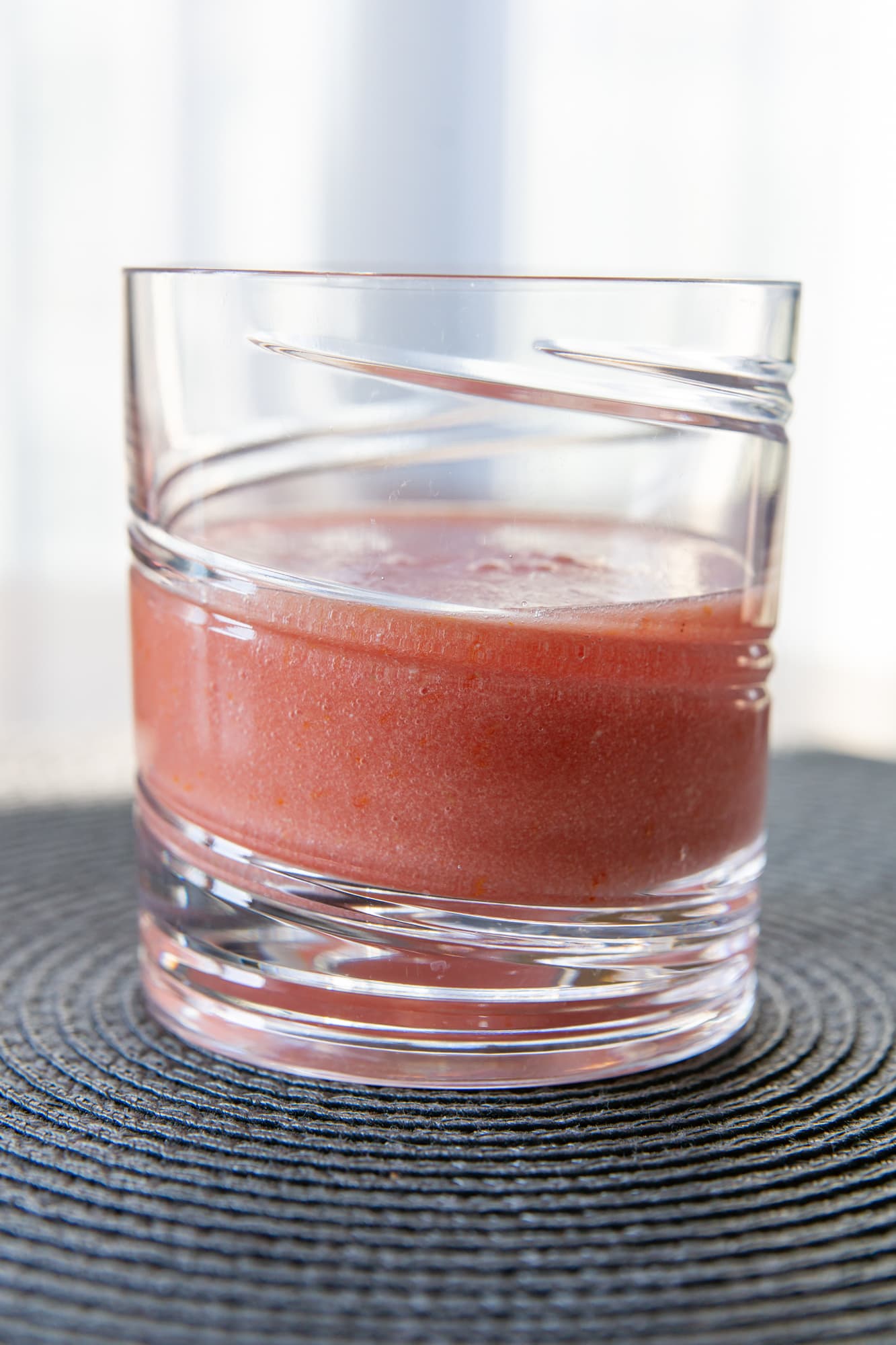 В кувшин поместили 450 г нарезанных не очень мелкими дольками помидоров и включили рекомендуемую для блендера 7-ю скорость. Уже на 5-й секунде томаты превратились в пюре, но кусочки шкурки были сильно заметны. Через 1 минуту мы остановили прибор.