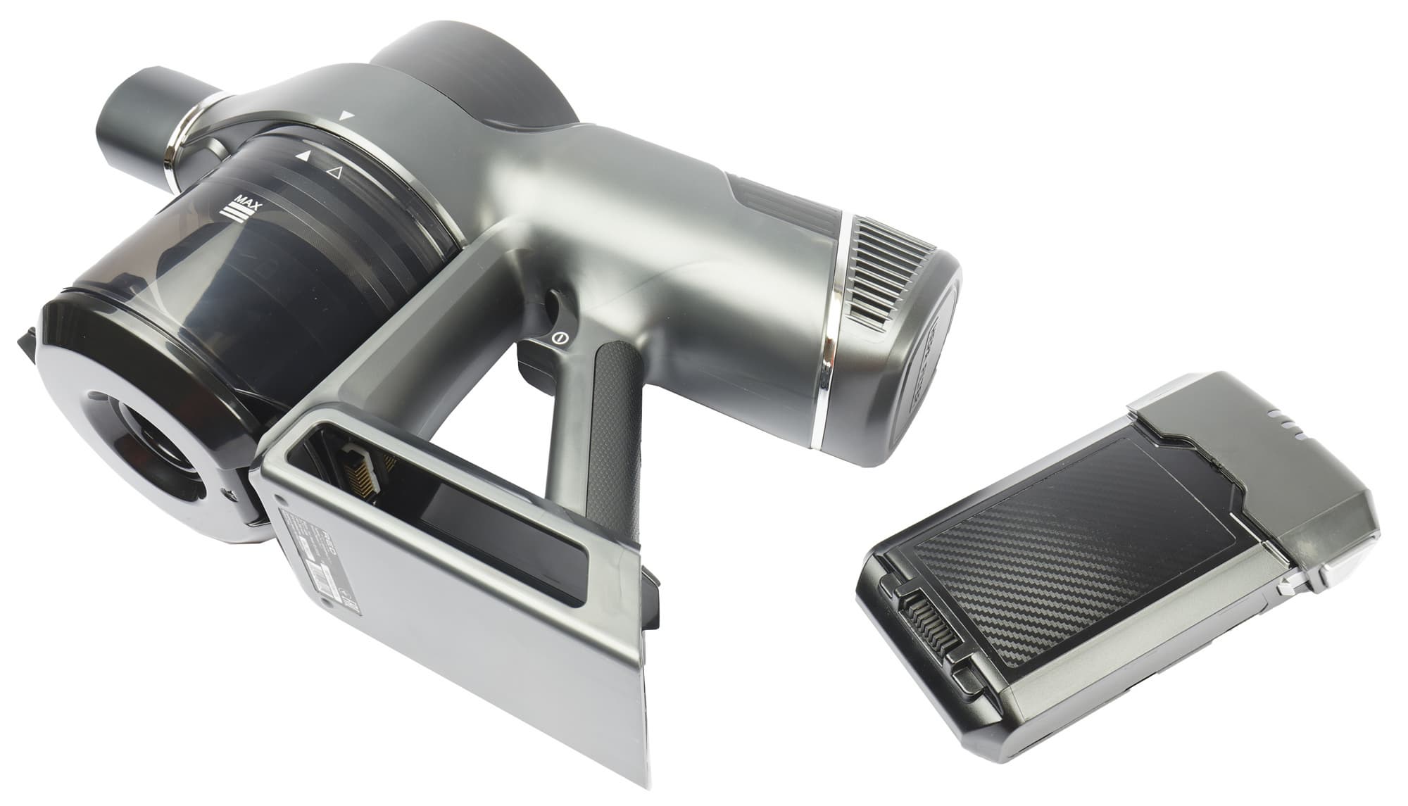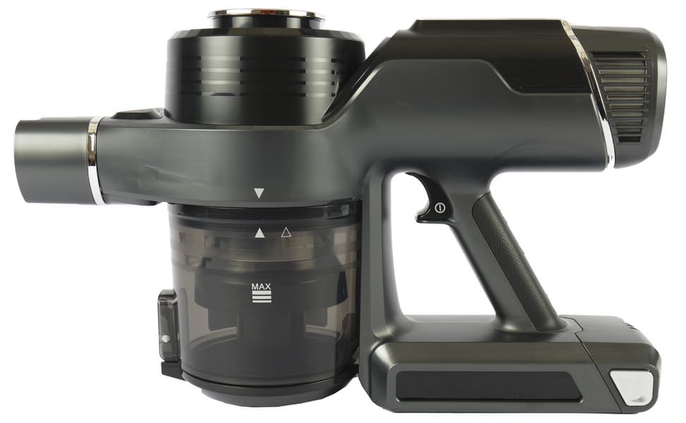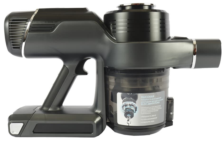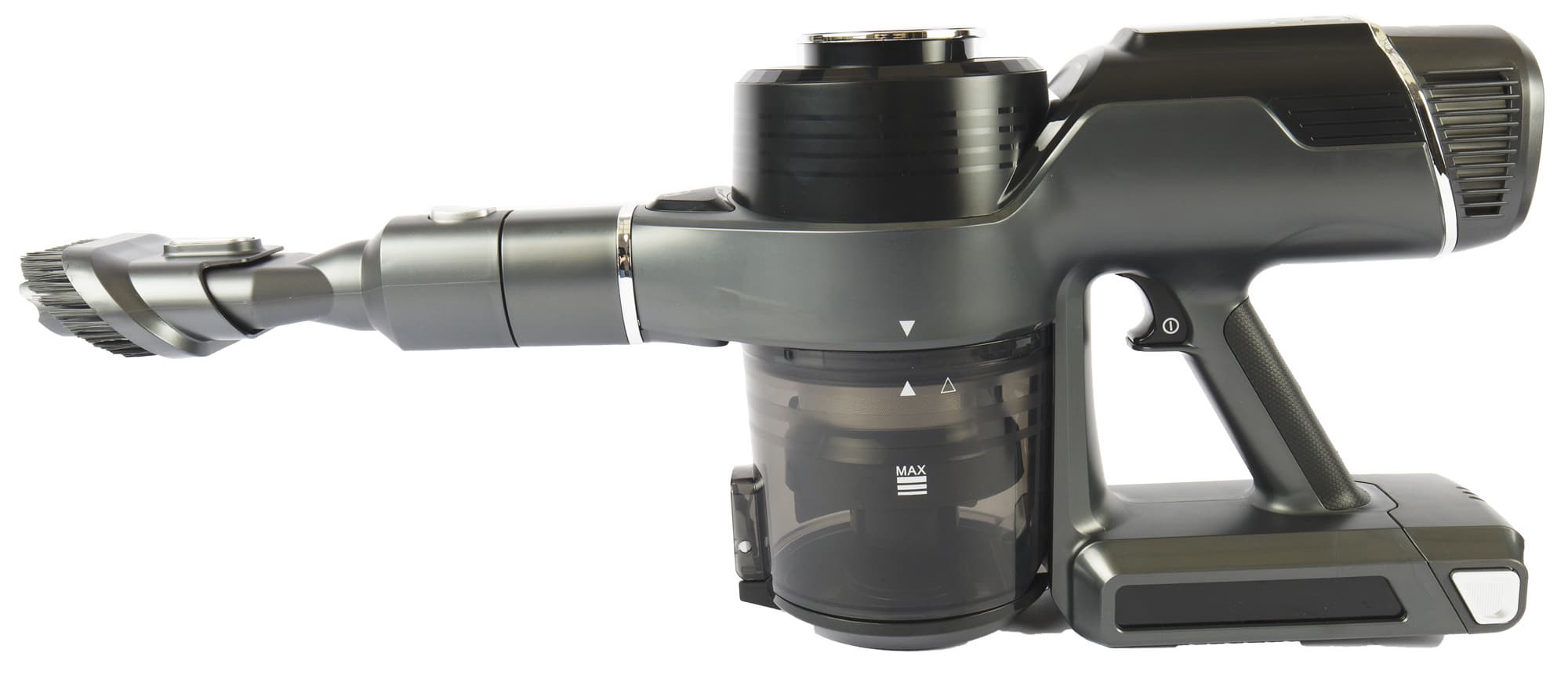 У этой модели поперечная компоновка: емкость для мусора с циклонным фильтром расположена перпендикулярно воздушному тракту. Над контейнером размещен электродвигатель. Выпускной фильтр — над ручкой традиционного «пистолетного» типа, а аккумуляторный отсек смонтирован под ней.