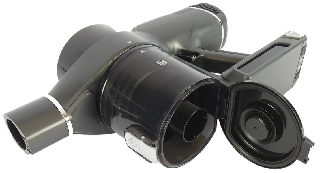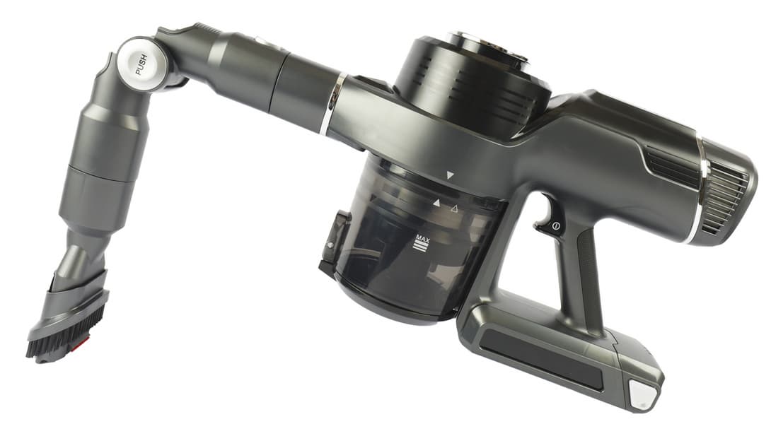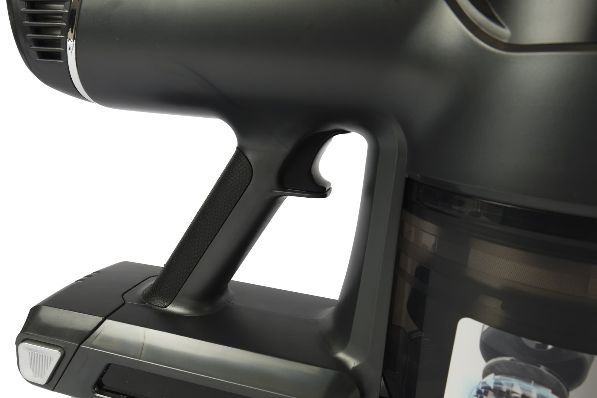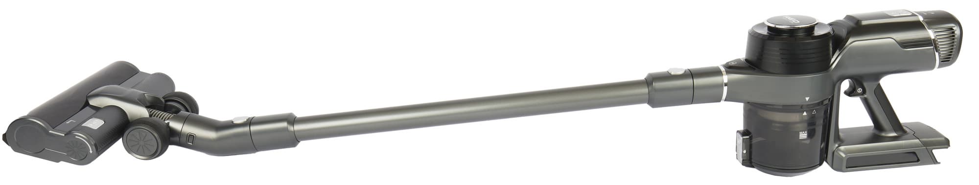 У этой модели поперечная компоновка: емкость для мусора с циклонным фильтром расположена перпендикулярно воздушному тракту. Над контейнером размещен электродвигатель. Выпускной фильтр — над ручкой традиционного «пистолетного» типа, а аккумуляторный отсек смонтирован под ней.