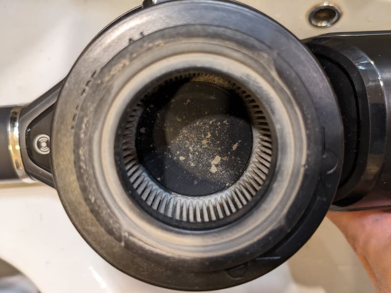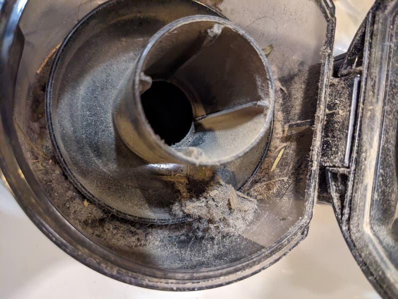 Часть мусора, тем не менее, скапливается выше «юбки» циклона между ним и стенками резервуара. Чтобы удалить его полностью, следует извлечь центральный элемент.