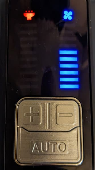 На дисплее рядом с кнопками отображается выбранный режим мощности (голубая линейка) и заполненность мусоросборника (красная шкала).