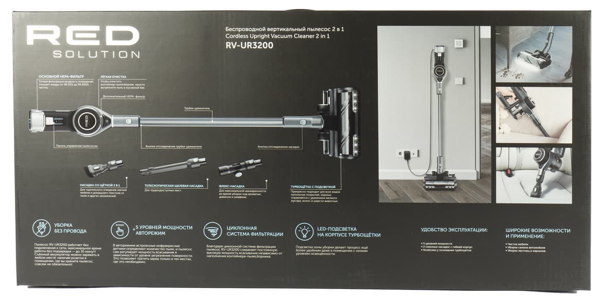 В ходе лабораторных и практических тестов вертикальный аккумуляторный пылесос Red RV-UR3200 продемонстрировал высокую мощность всасывания в максимальном режиме и неплохую продолжительность работы в минимальном. Благодаря пятиступенчатой регулировке пользователь легко может выбрать оптимальное для любой задачи соотношение мощности и длительности автономной работы, а адекватно настроенный автоматический режим позволяет переложить управление мощностью на сам прибор.