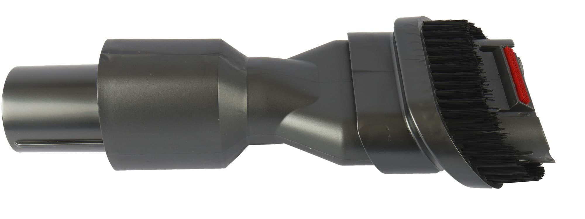 Конструкция флекс-насадки позволяет изгибать ее под произвольным углом приблизительно до 100°, в раструб на корпусе она может вставляться как шарниром вверх (на фото), так и наоборот, вверх щеткой. Такое решение позволяет без труда чистить узкие пространства — к примеру, под мебелью или на шкафах.