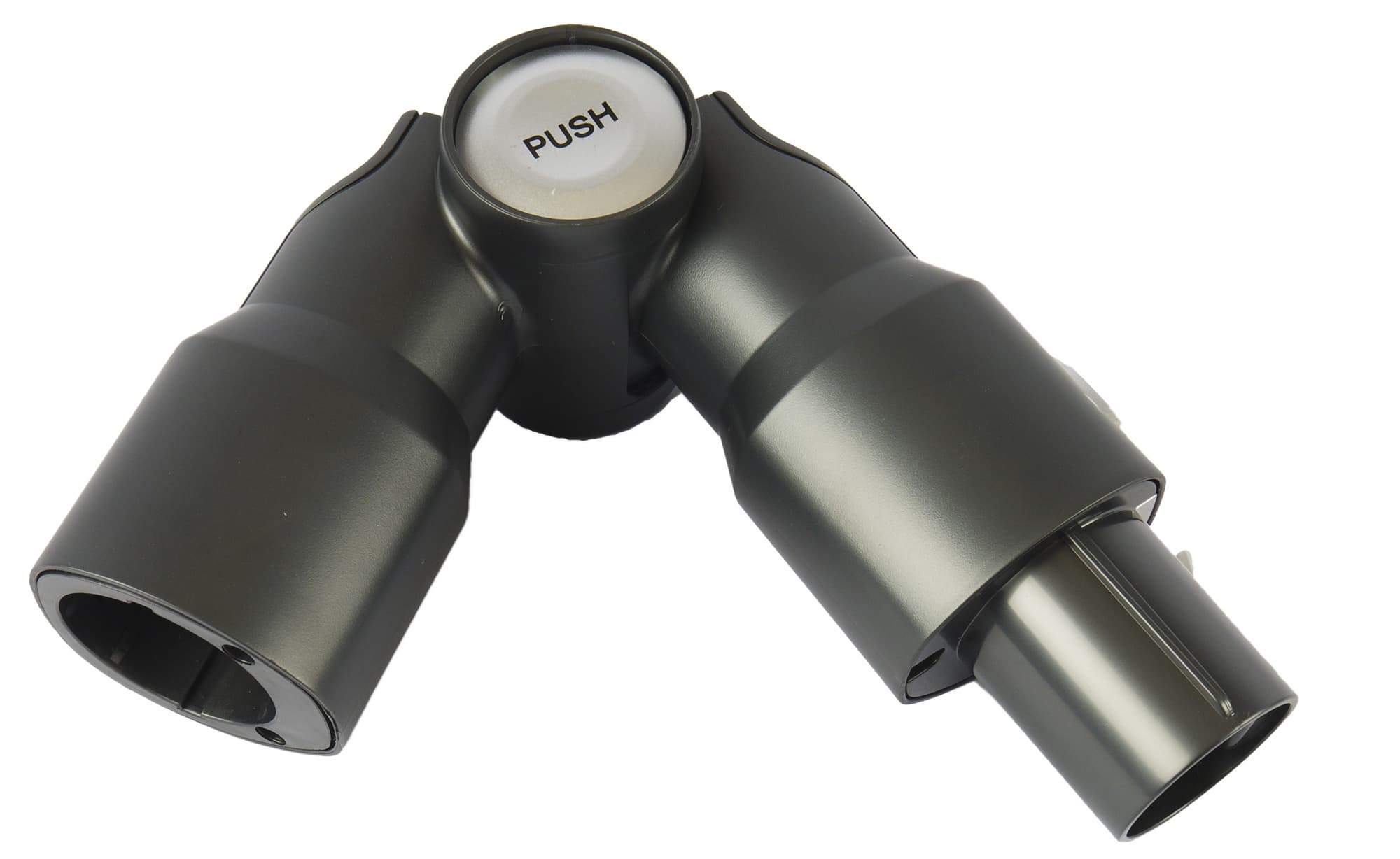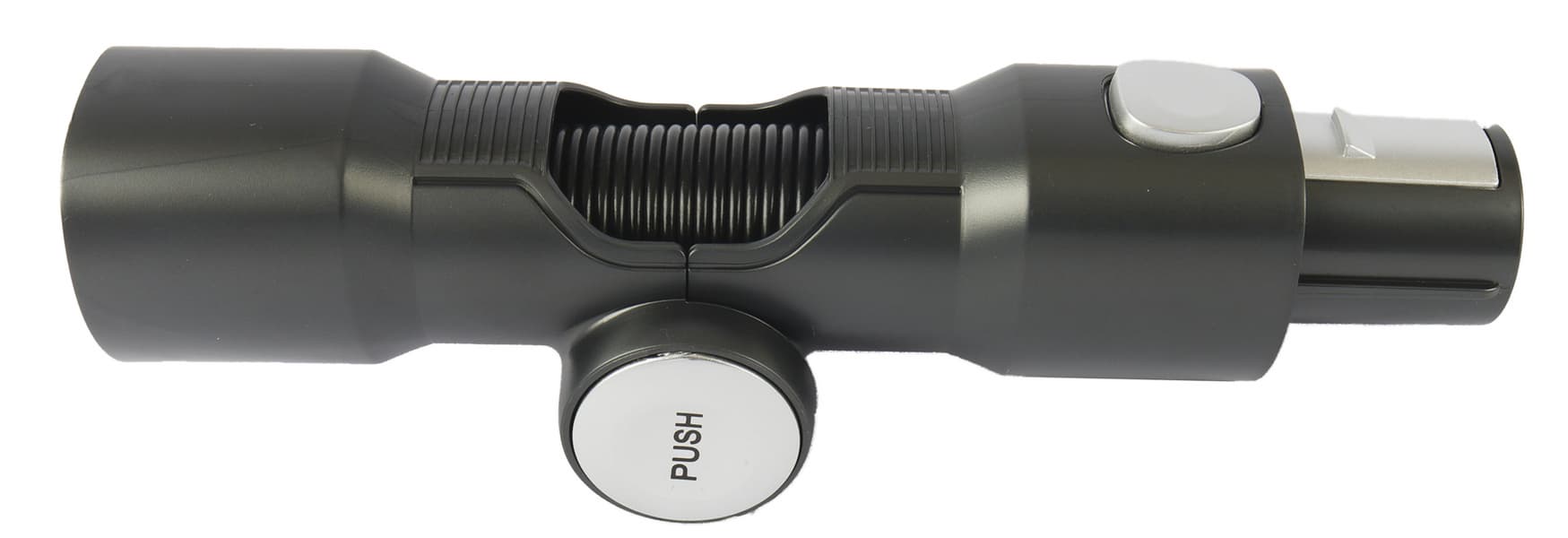 Флекс-насадка предназначена для облегчения ручной уборки — на использование с электроприводом она не рассчитана. Шарнир в средней части аксессуара позволяет изгибать конструкцию почти на 100°, а для фиксации в выбранном положении служит кнопка с надписью «Push».