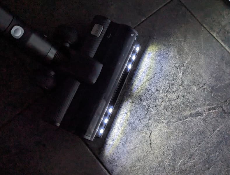 Ну и, конечно, подсветка рабочей зоны — очень полезная вещь. В этой модели светодиоды прекрасно выделяют на полу мелкий невидимый мусор и помогают прибираться даже в темном помещении. Кстати, мы замечаем, что даже при ярком общем освещении такой дополнительный фокус на пыли существенно облегчает работу: низко расположенные источники света создают контрастные тени и хорошо выделяют соринки.