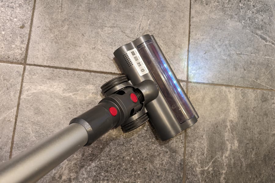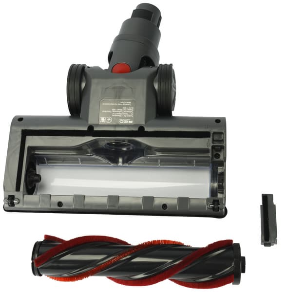 В конфигурации для уборки пола основной вес пылесоса приходится на два больших обрезиненных ролика в «пятке» насадки. Еще два небольших колеса размещены в передней части, а для улучшения прилегания к поверхности и облегчения скольжения предназначены щеточные элементы сзади и по бокам от ротора.
