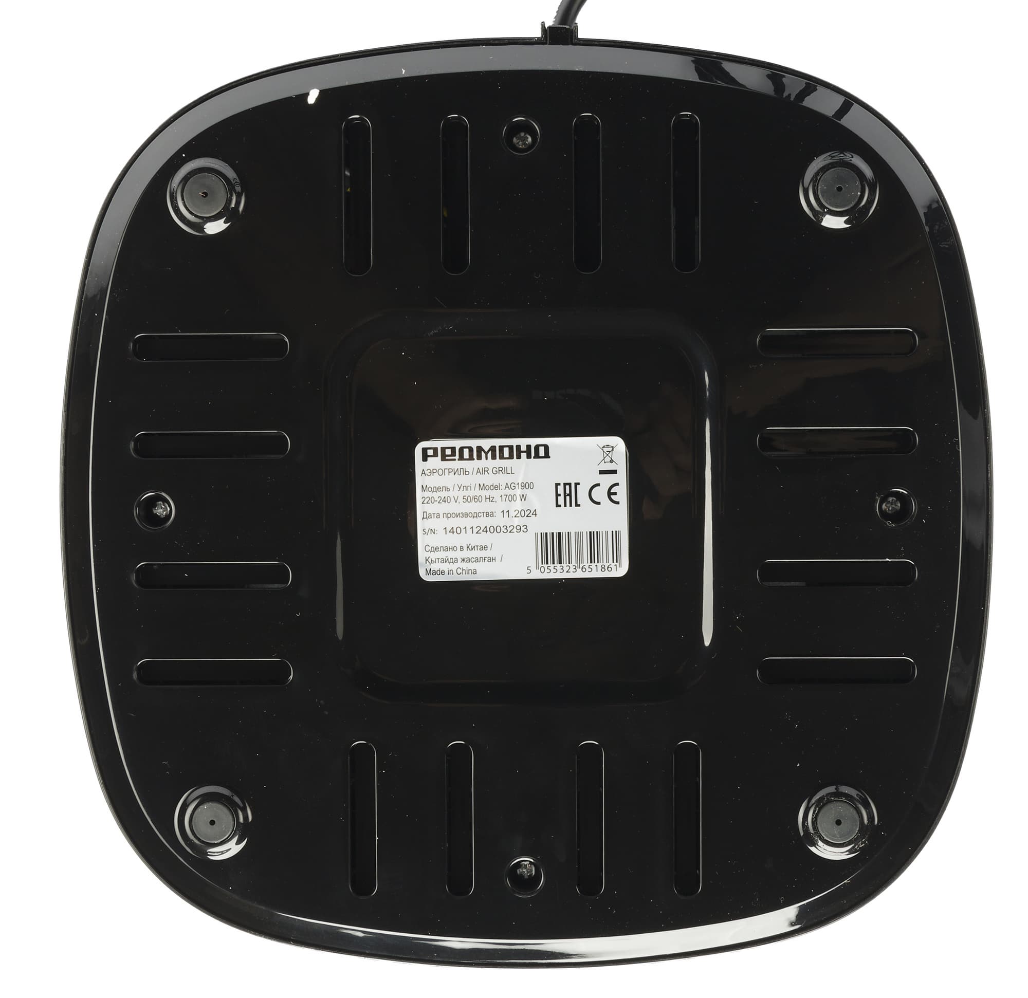 Нижняя панель оборудована резиновыми ножками, препятствующими скольжению, а также вентиляционными отверстиями для охлаждения гриля во время работы.