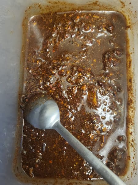 Начать мы решили с пастрами из индейки. Смешали растительное масло с травами, сушеным чесноком, паприкой, солью и перцем. Натерли мясо этой смесью со всех сторон и отправили на ночь в холодильник, чтобы оно промариновалось.