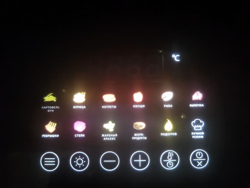 - кнопка настройки температуры и времени приготовления (градусник и часы, разделенные горизонтальной чертой)