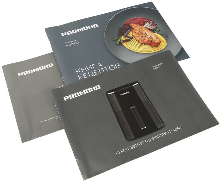 К инструкции прилагается яркая и красочная книга рецептов, в которой даны рекомендации по приготовлению блюд в аэрогриле, а также приводится 50 рецептов различных блюд: из мяса, птицы, рыбы и морепродуктов, овощей и фруктов, рецепты салатов, закусок и даже выпечки.