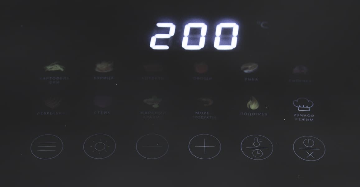 Максимальная температура передней панели во время работы была 70 °C, верхней панели с кнопками управления — 30 °C. Понятно, что лучше не прикасаться к панелям голыми руками в процессе работы аэрогриля, но опасности сильно обжечься нет.