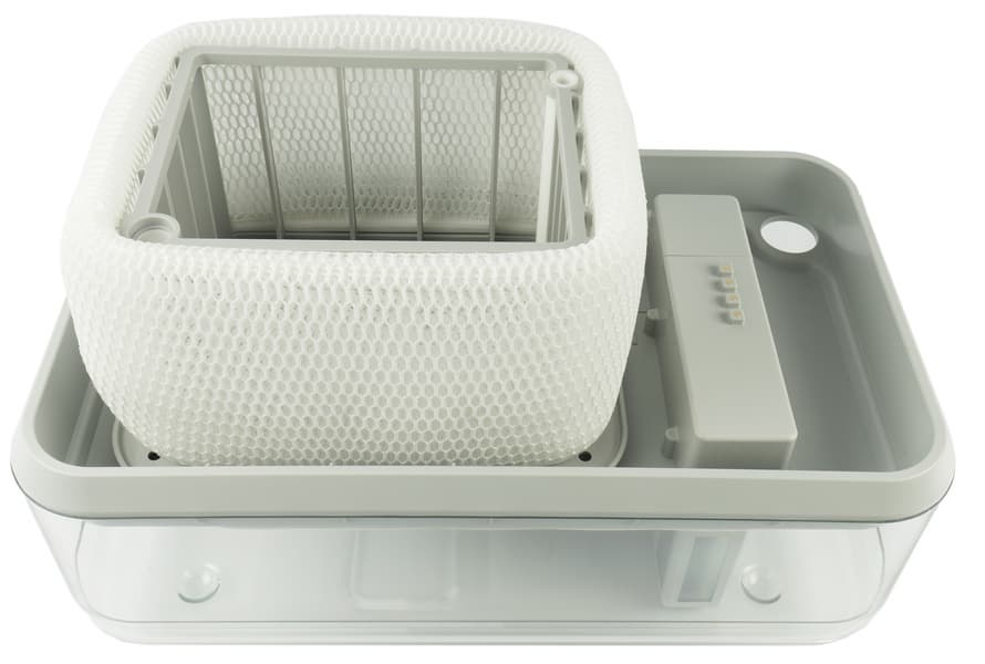 Главный рабочий элемент климатического комплекса — увлажнитель на крышке резервуара. Конструкция из синтетической сетки орошается водой, которую подает из емкости насос, а проходящий через нее воздух очищается и насыщается влагой.