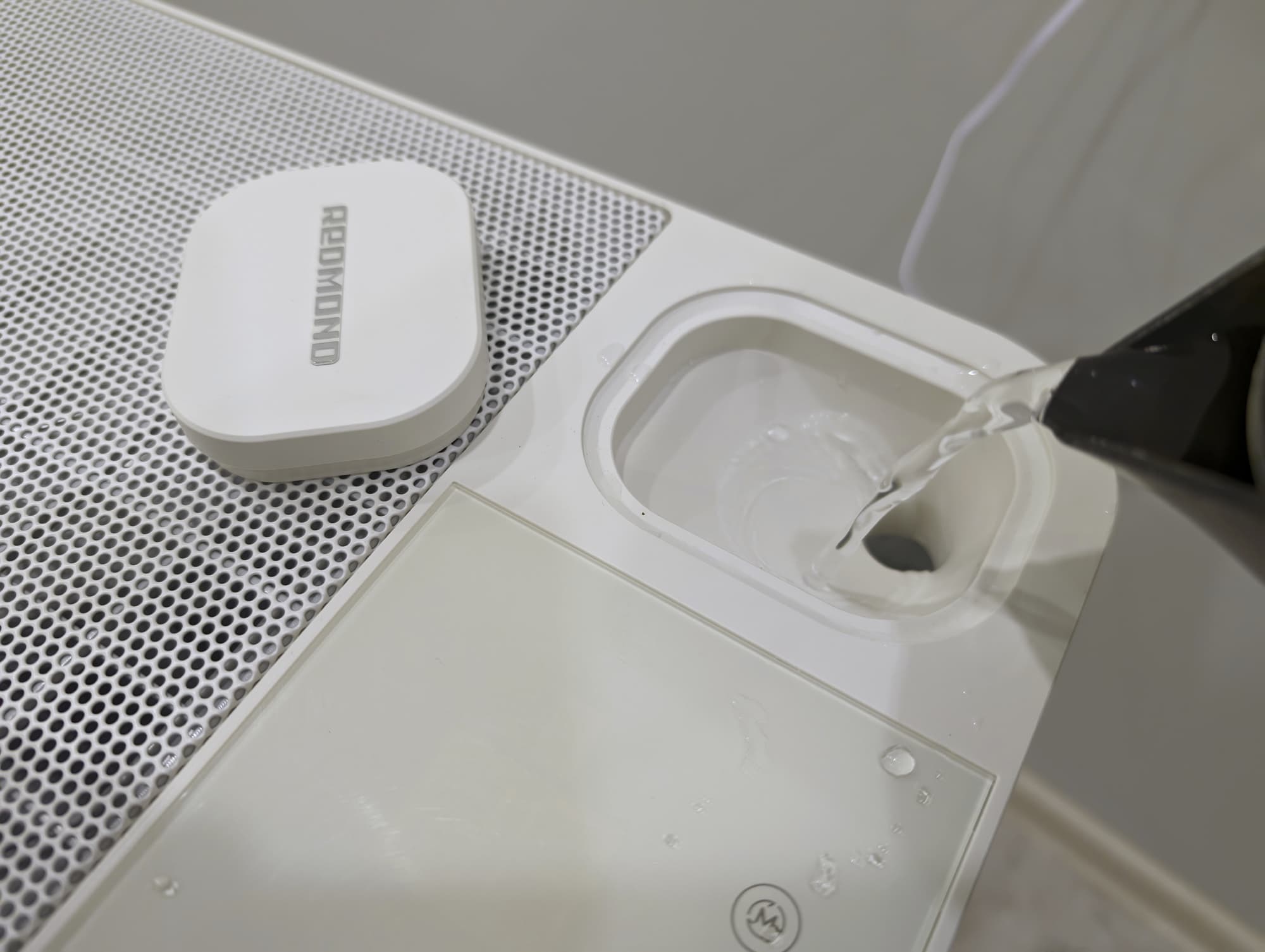 Она закрыта крышкой с логотипом производителя, под которой находится воронка: через нее вода попадает в резервуар увлажнителя.