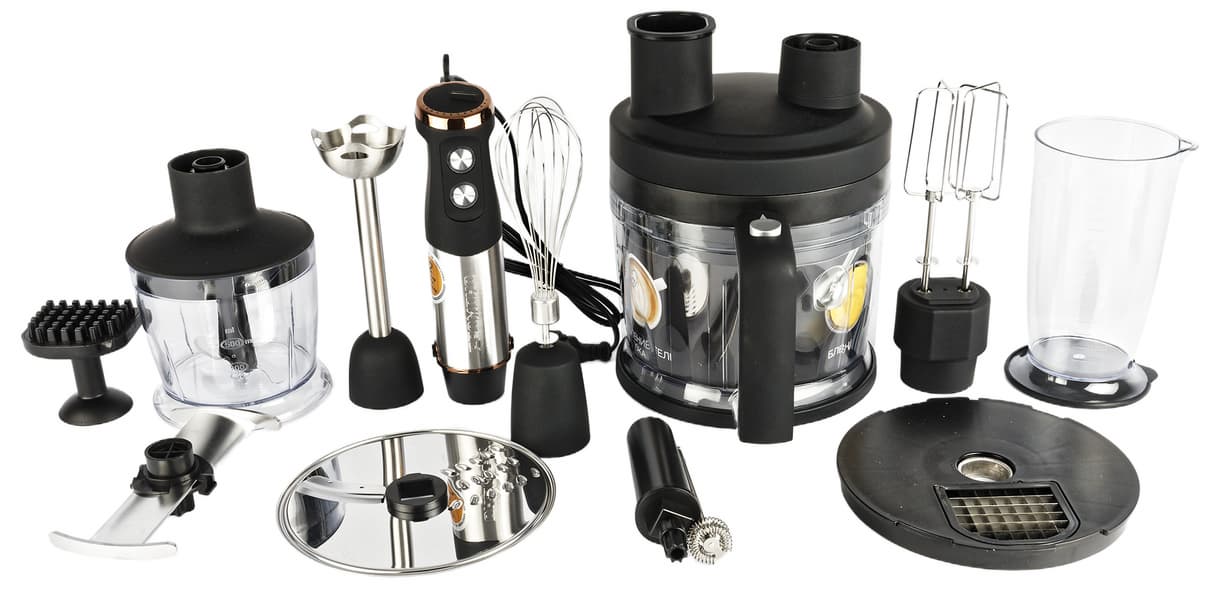 Блендер Redmond BH408 относится именно к такой категории. Это устройство мощностью 1500 Вт с большим набором насадок, которое умеет смешивать, взбивать, измельчать и даже нарезать продукты кубиками. Помимо стандартного погружного блендера, в комплекте есть капучинатор, венчик, две чаши измельчителя (0,5 и 2 л), а скорость работы можно регулировать плавно или использовать турбо-режим.