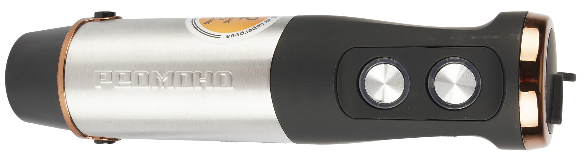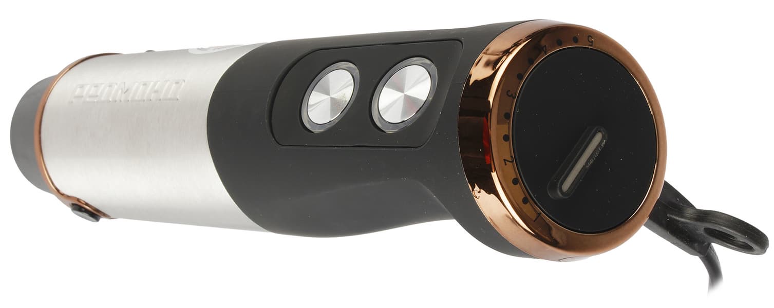 Из верхней части корпуса выходит шнур электропитания длиной 120 см. Место соединения шнура с держателем защищено кожухом из плотной резины. Кнопки управления на лицевой стороне серебристые, а под ними находится светодиодная подсветка.