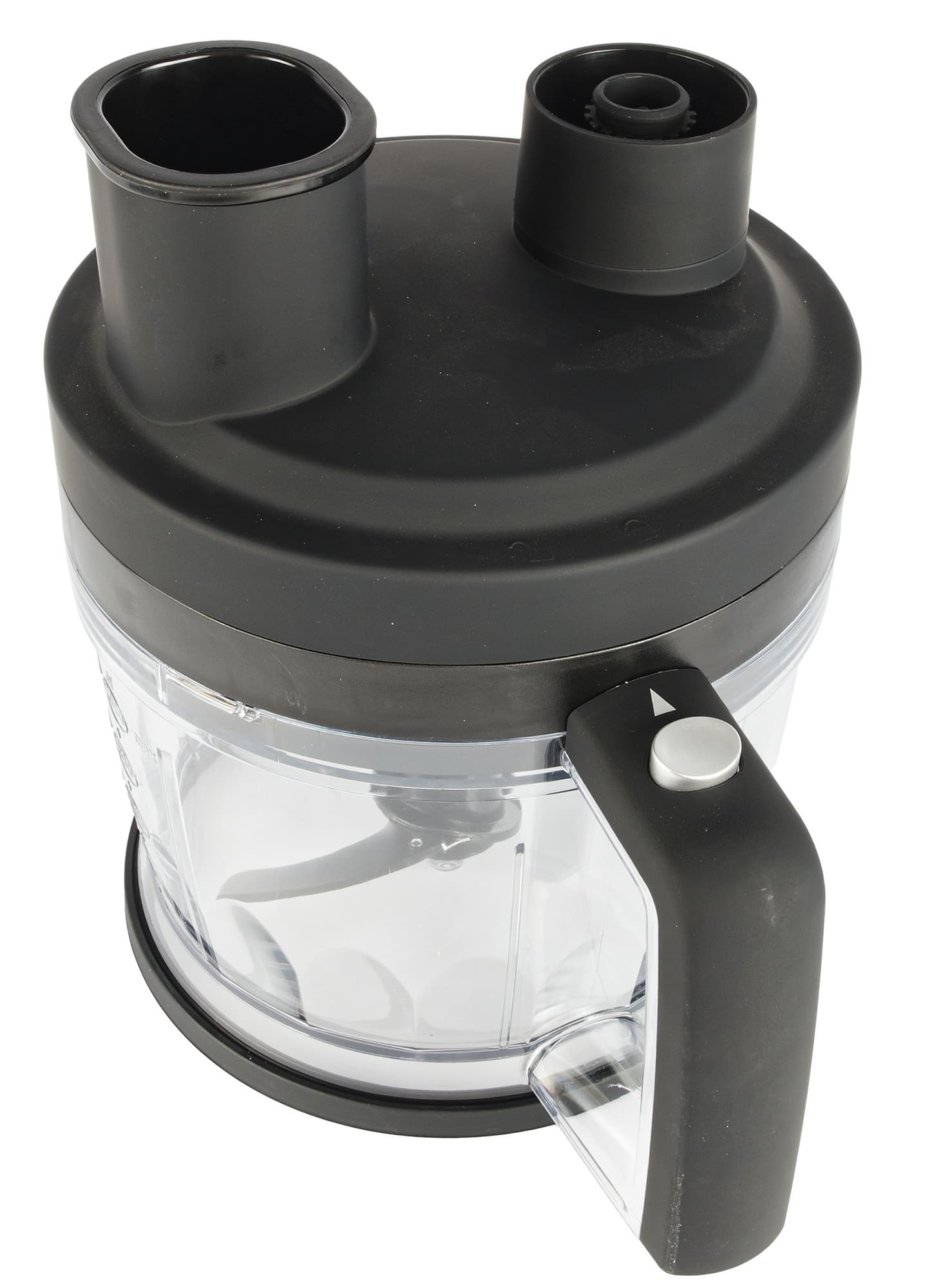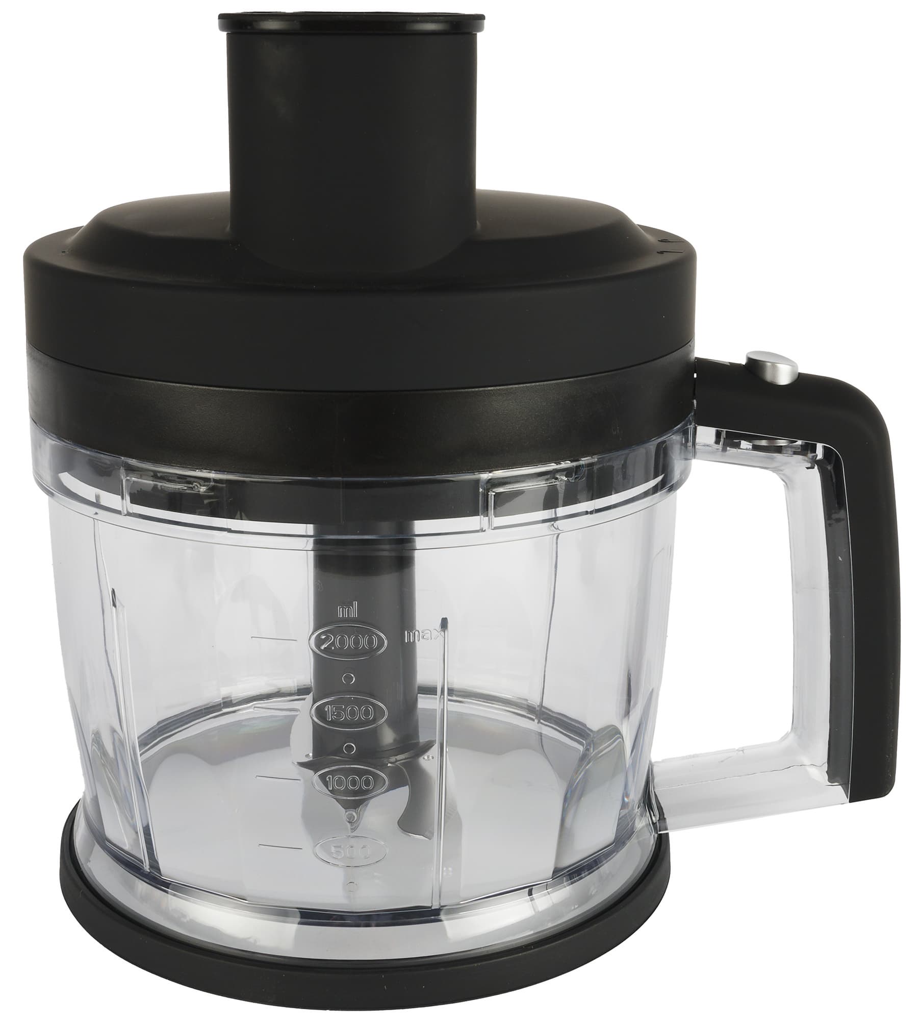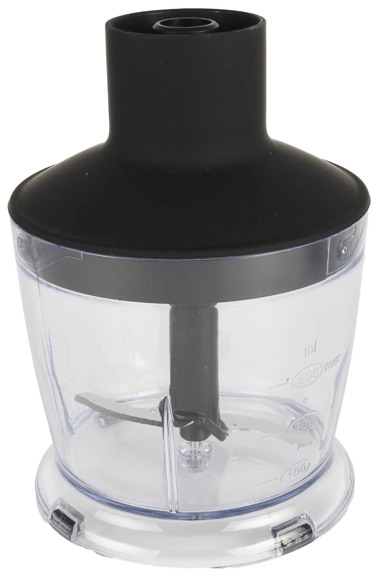 Малая чаша измельчителя объемом 500 мл выглядит классически: емкость, суженная к низу с рисками (миллилитры и унции) с двух сторон, внутри посередине штырь для установки s-образного ножа и крышка с возвышением для присоединения моторного блока.