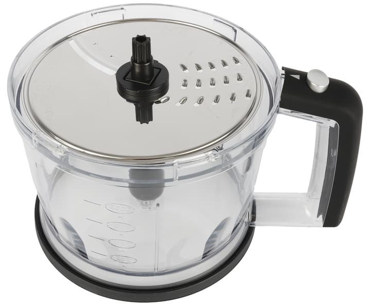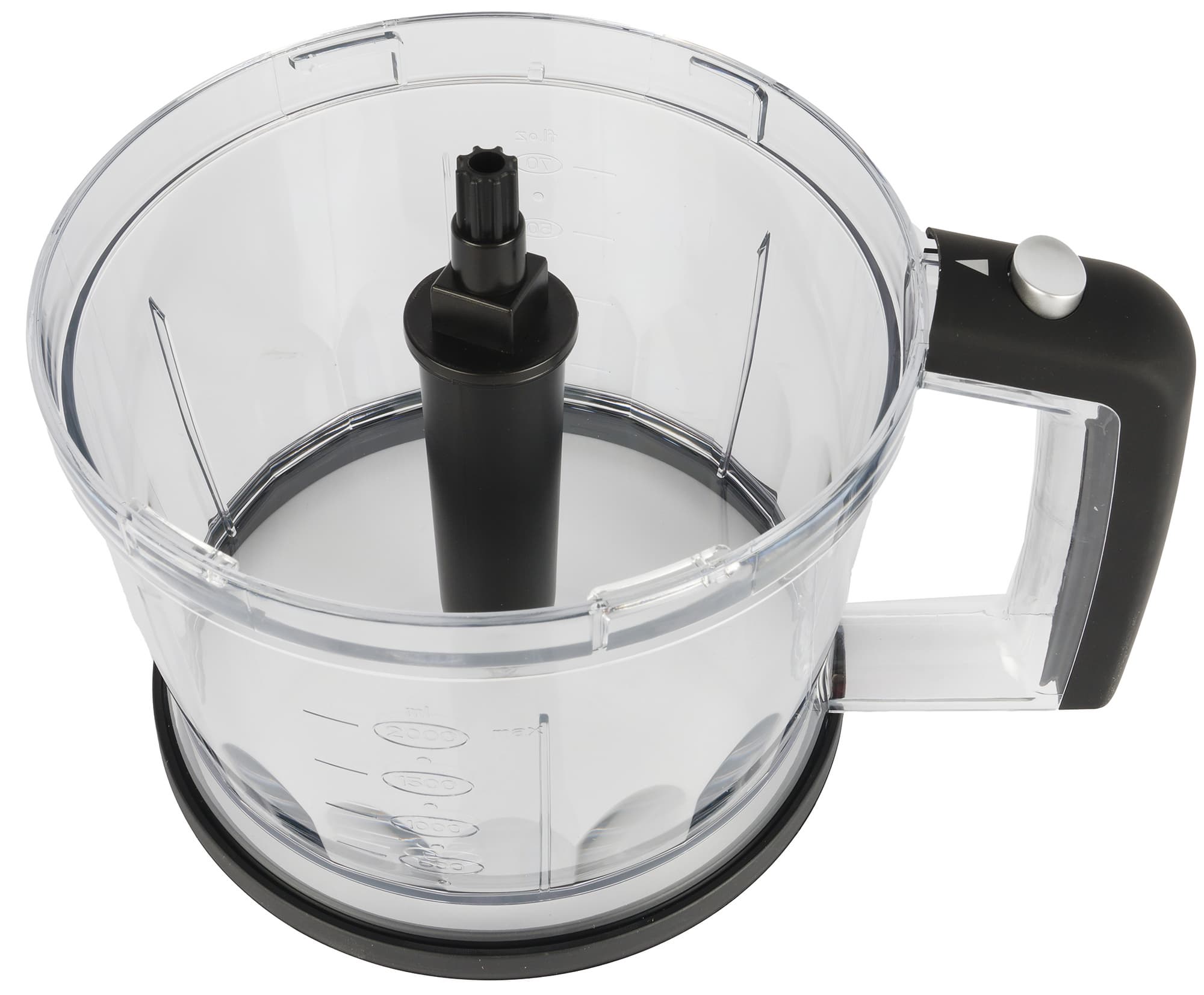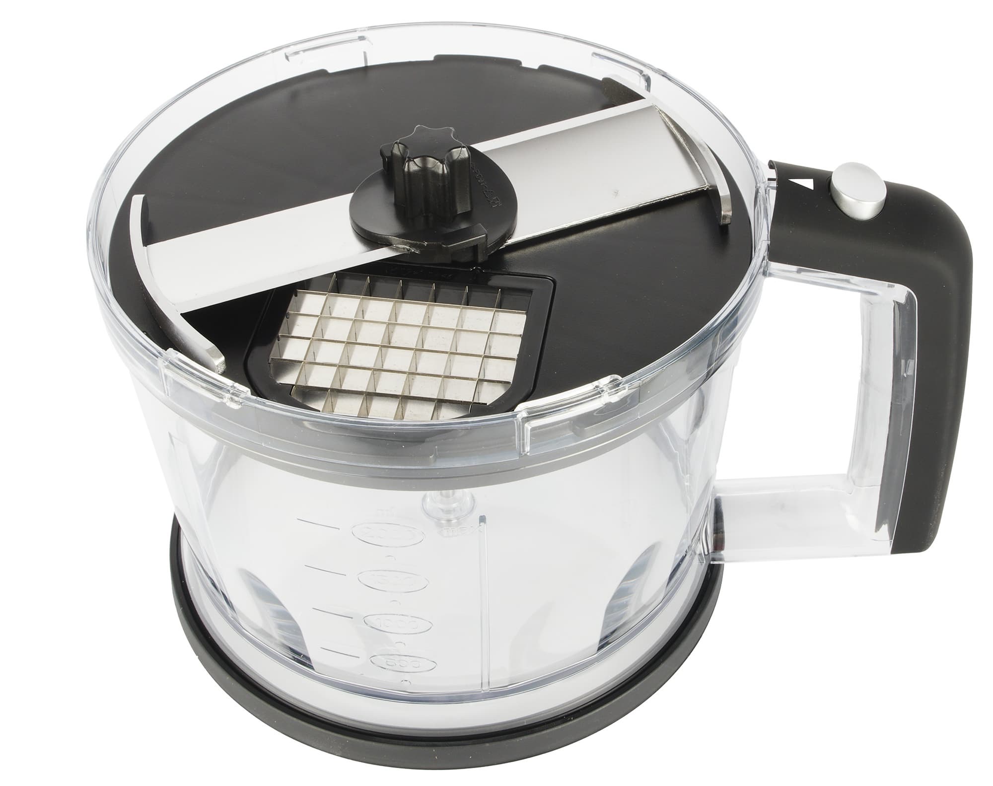 Малая чаша измельчителя объемом 500 мл выглядит классически: емкость, суженная к низу с рисками (миллилитры и унции) с двух сторон, внутри посередине штырь для установки s-образного ножа и крышка с возвышением для присоединения моторного блока.