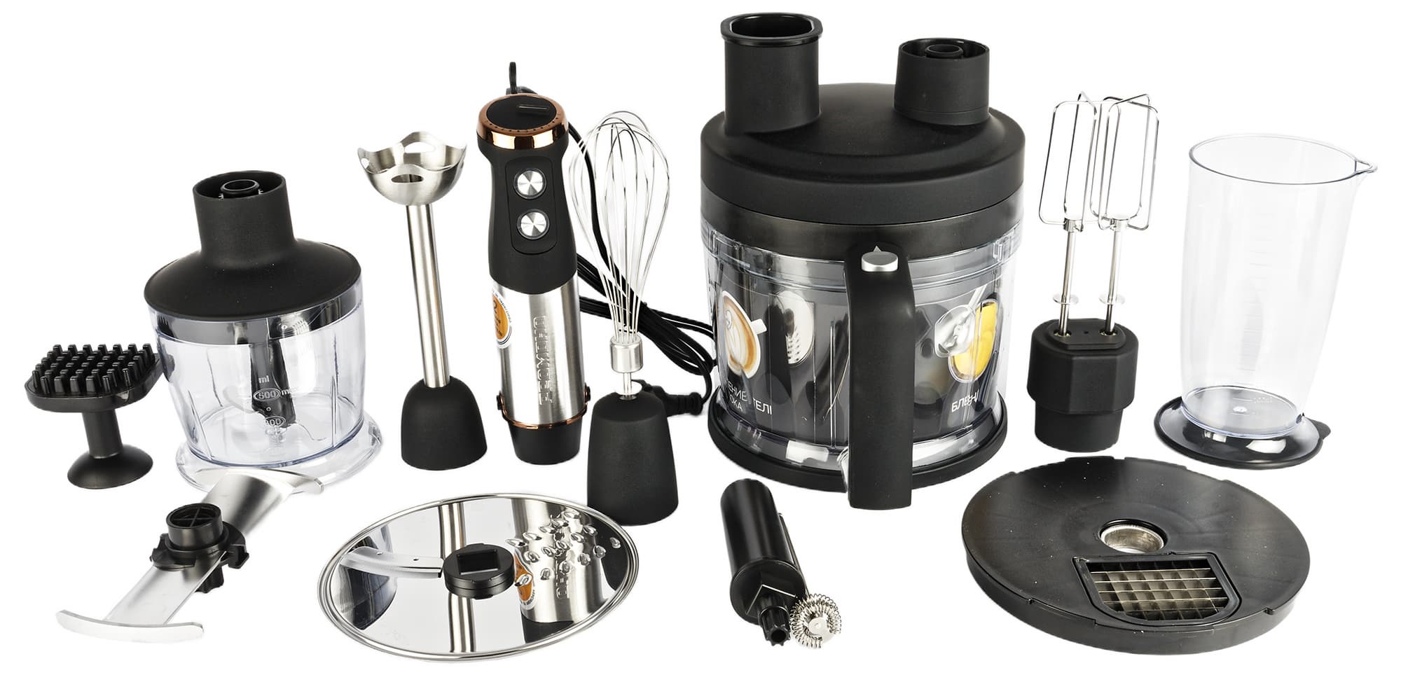| Насадки | погружной блендер, 6-дужный венчик, насадка-миксер с двумя венчиками, режущий диск (терка/шинковка), насадка для резки кубиками, капучинатор, малый нож измельчителя, большой нож измельчителя |
