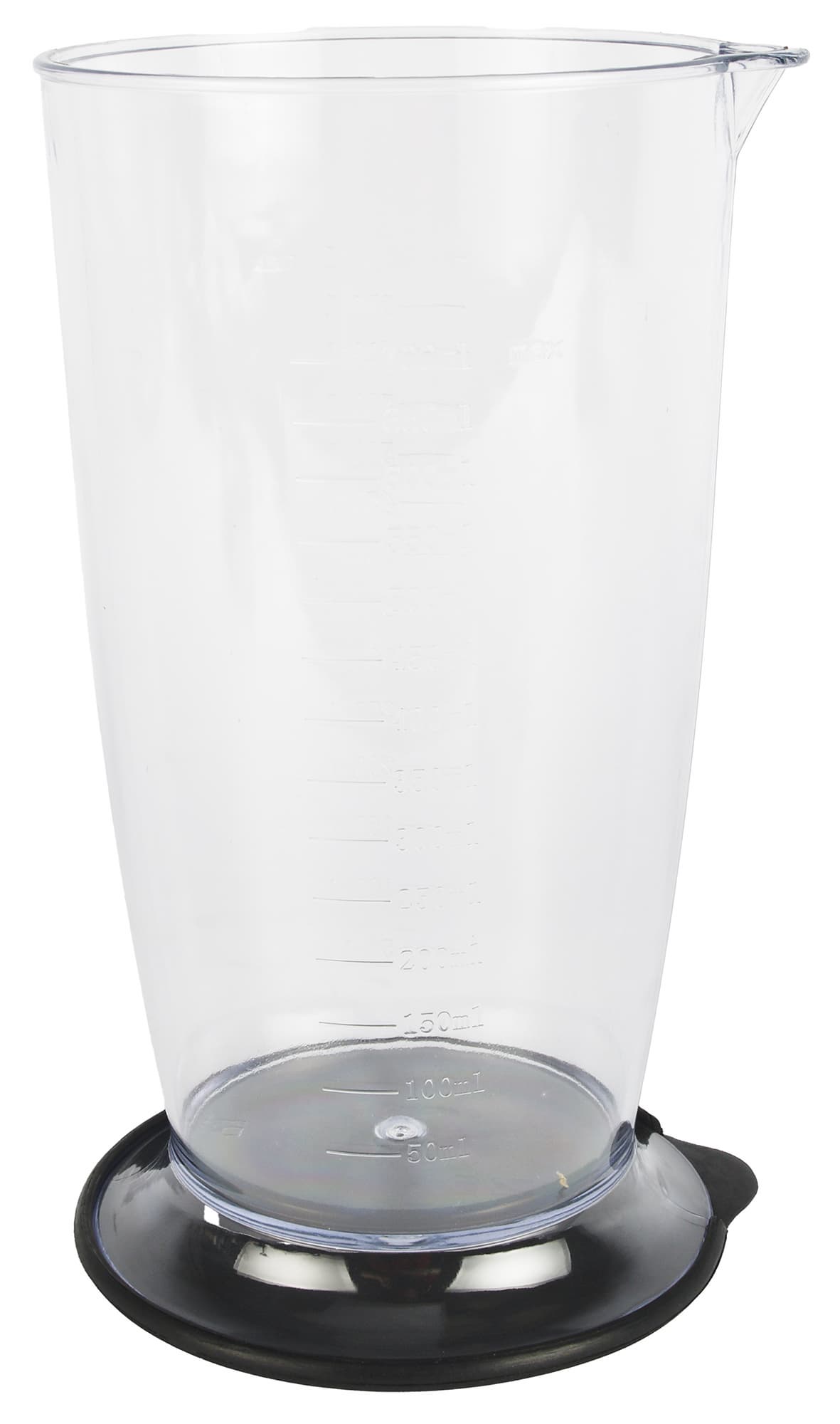 Большая чаша тоже изготовлена из прозрачного пластика. Основание емкости оснащено резиновым кольцом, улучшающим сцепление с поверхностью стола. На стенках чаши две шкалы: в унциях (от 10 до 70) и миллилитрах (от 500 до 2000).