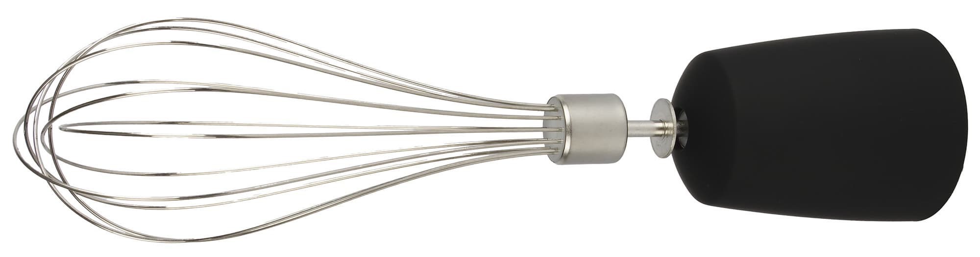 Для взбивания наш блендер оснащен 6-дужным венчиком. Насадка вставляется в переходник (для чего нужно приложить небольшое усилие) из пластика с покрытием Soft-touch, который в свою очередь крепится к моторному блоку.