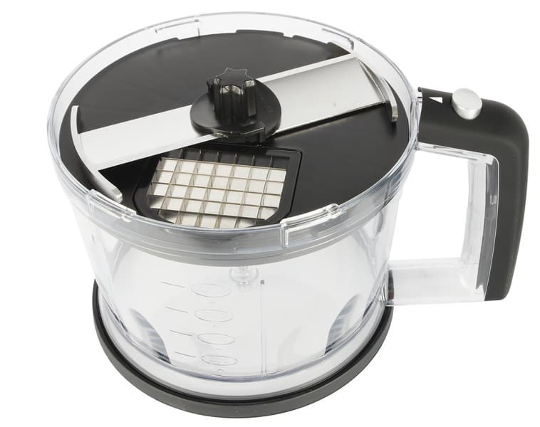Насадка для нарезки кубиками состоит из массивного пластикового диска с режущей решеткой и вращающегося ножа. В процессе работы он нарезает продукты ломтиками, которые под собственным весом и/или при помощи толкателя проходят через нож-решетку и падают в чашу в виде кубиков.