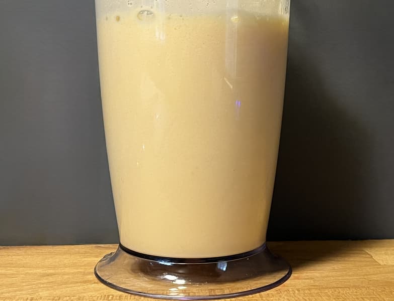 Погружная насадка сработала чисто: брызг не было, продукты не застревали. Мерный стакан отлично держится на рабочей поверхности, если его резиновую крышку подставить снизу. Венчик также справился со своей задачей без труда.