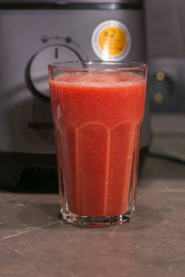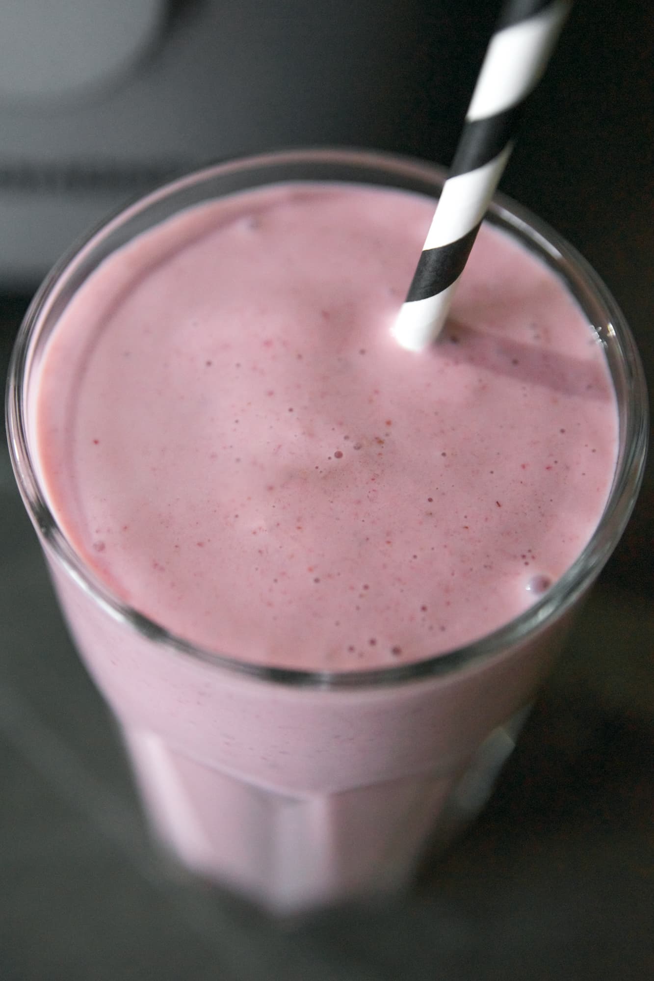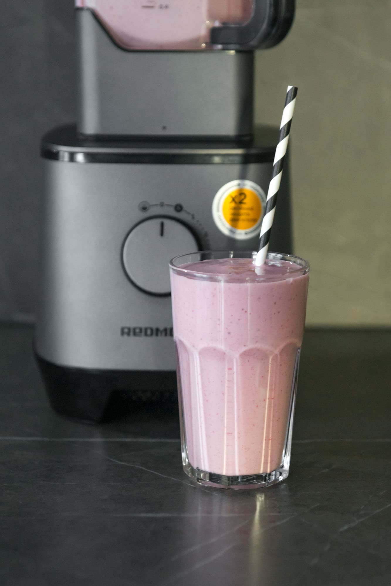 Через 2 минуты масса уже выглядела однородной, но слишком густой, поэтому мы плеснули в кувшин еще около 50 мл молока и включили блендер в том же режиме на 10 секунд. В итоге — ни одной целой ягоды, а сам коктейль очень хорошо взбит.
