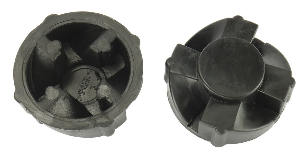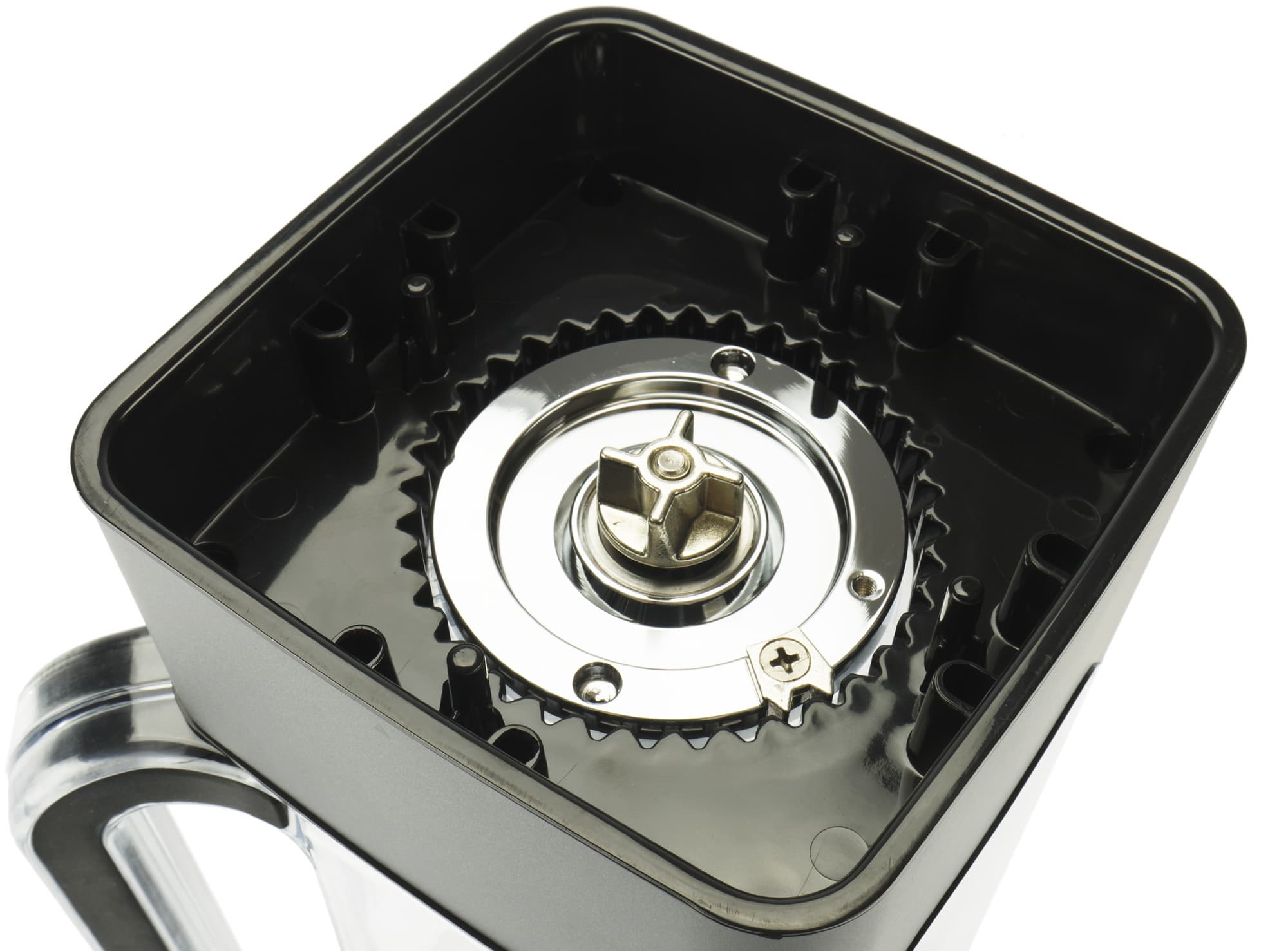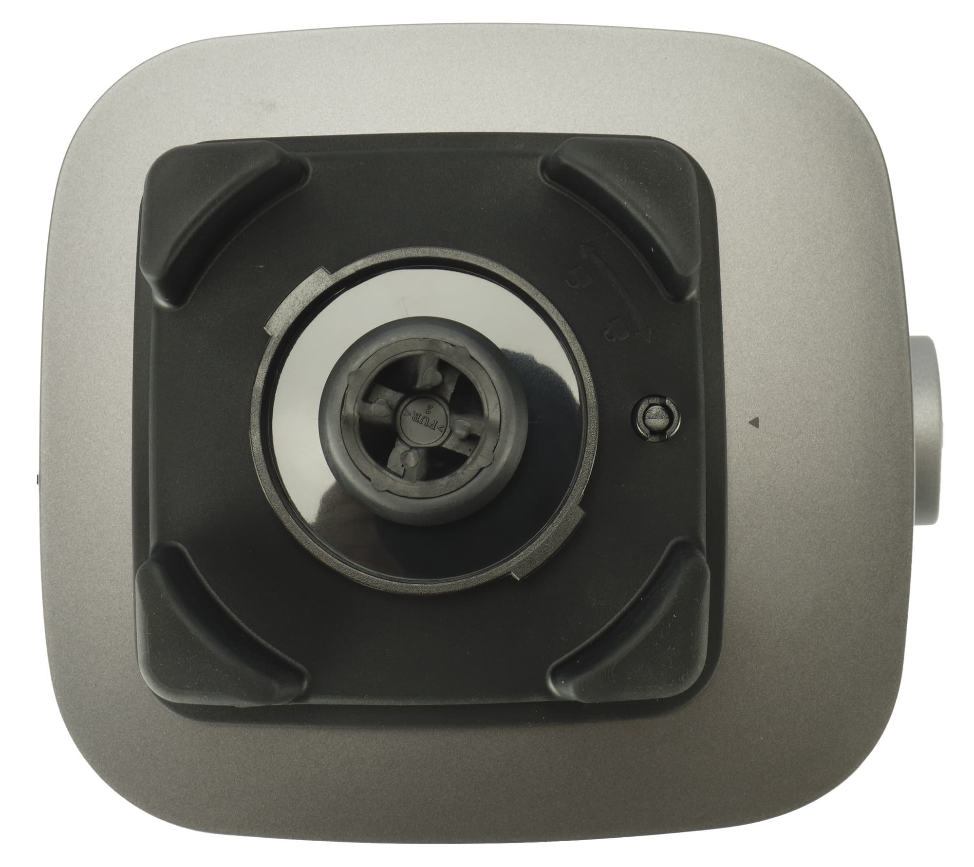 Площадка для установки кувшина оснащена съемной вибростойкой резиновой накладкой с четырьмя выступами и кнопкой безопасного выключения. Этот элемент не позволит запустить мотор если емкости на базе нет. Главное, чтобы кувшин встал на место, а в какую сторону будет повернута ручка — не важно. Соединение — металл/металл с резиновой муфтой для снижения вибрации при работе.
