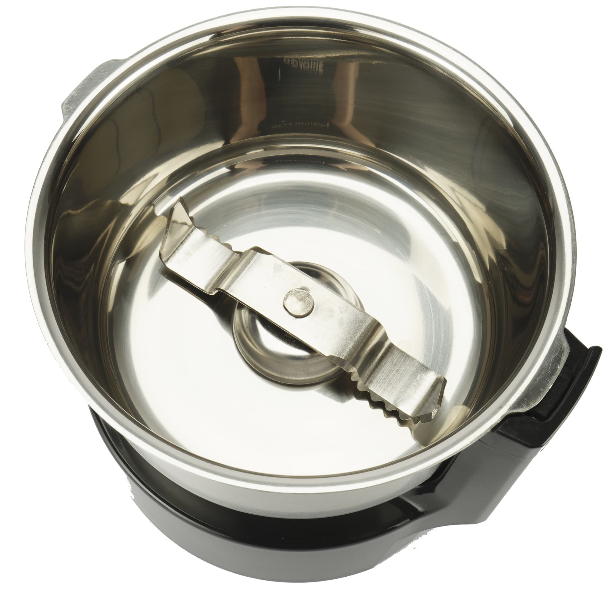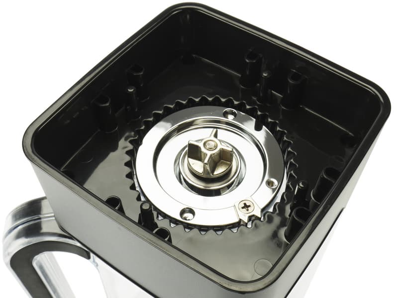 Дополнительная насадка в виде кофемолки — это металлическая чаша на пластиковом основании с блоком ножей из двух лезвий.