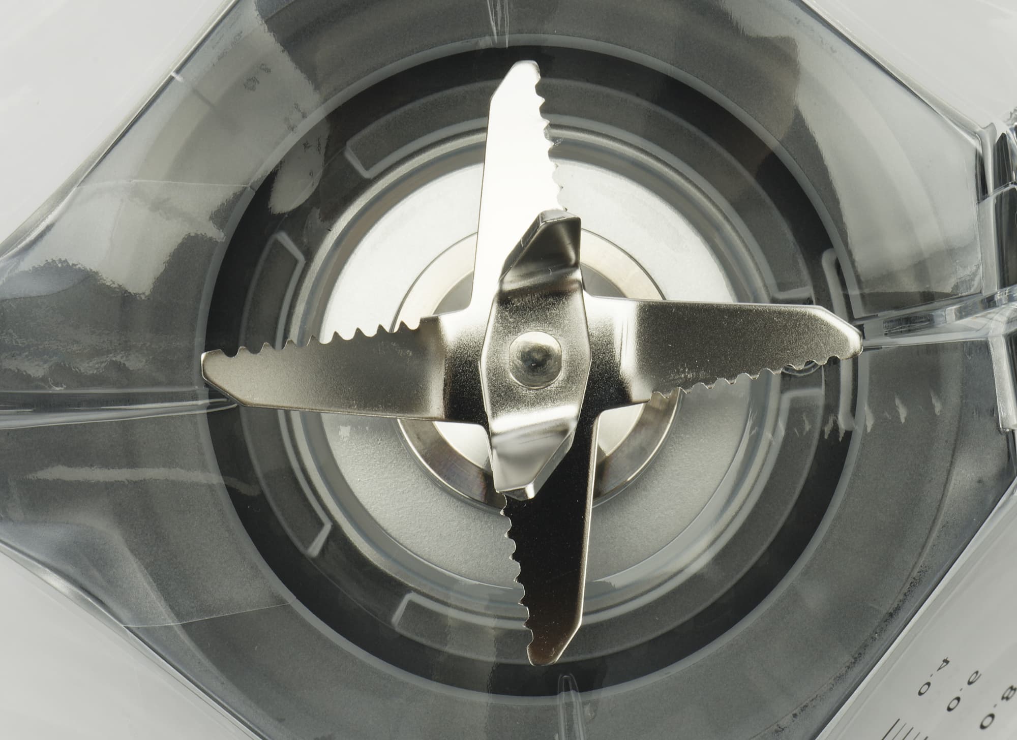 Несъемный ножевой блок из нержавеющей стали состоит из шести лезвий, расположенных на трех уровнях. Первые два параллельны дну, вторые немного загнуты вверх и еще два почти перпендикулярны основанию. Первые две пары имеют зубцы.