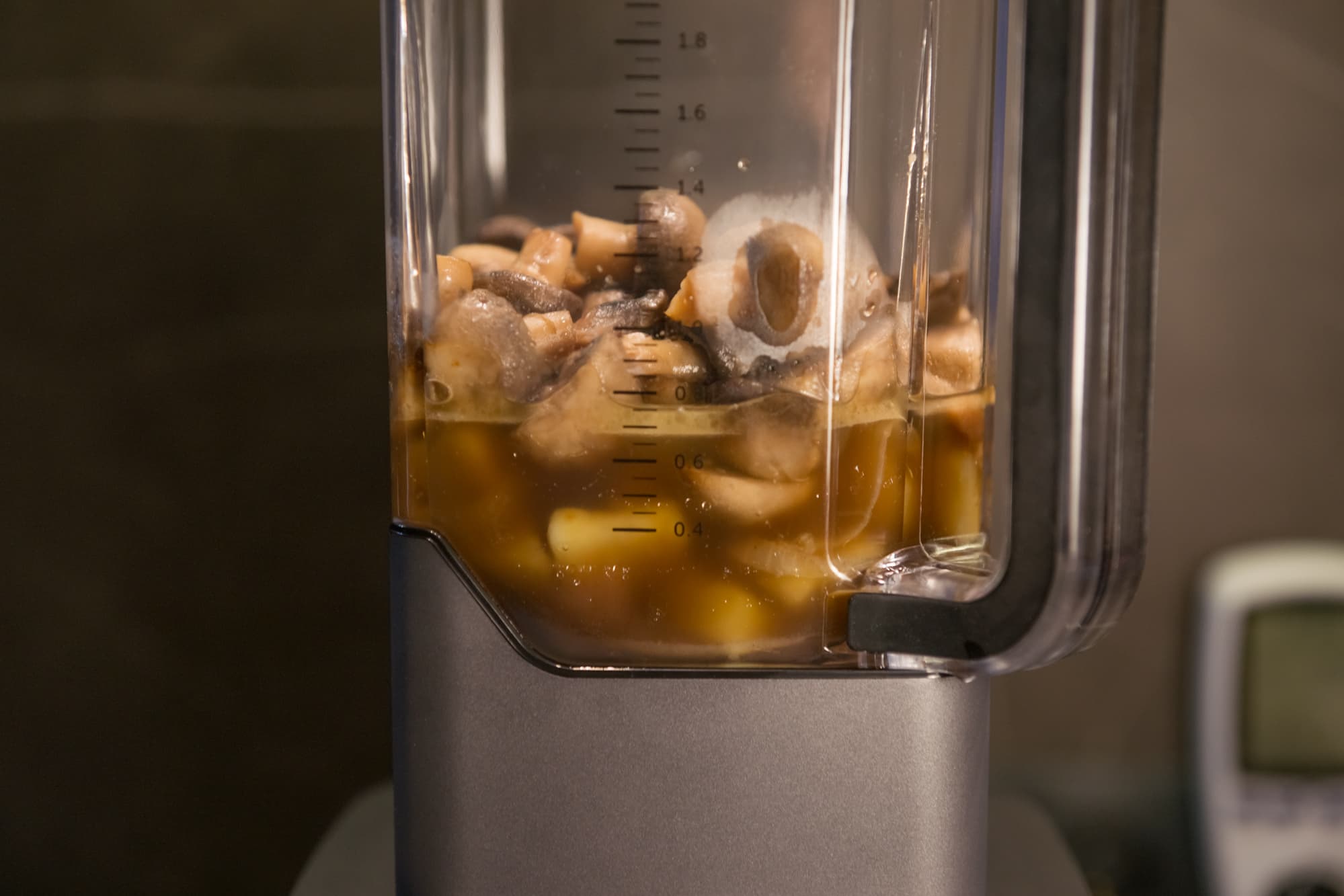 Предварительно сваренный картофель, обжаренные, а затем потушенные в курином бульоне шампиньоны немного остудили и поместили в кувшин блендера.