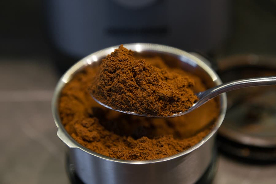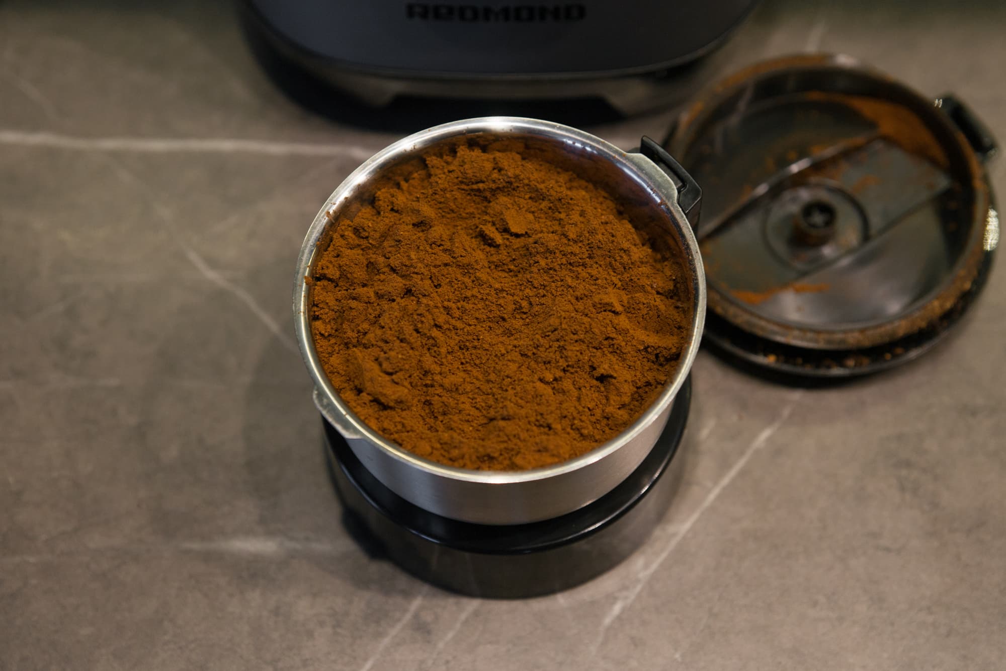 Закрыли емкость крышкой и включили авторежим кофемолки. По умолчанию режим работает 30 секунд, но уже через 20 мы решили остановить процесс и проверить, что у нас получилось.