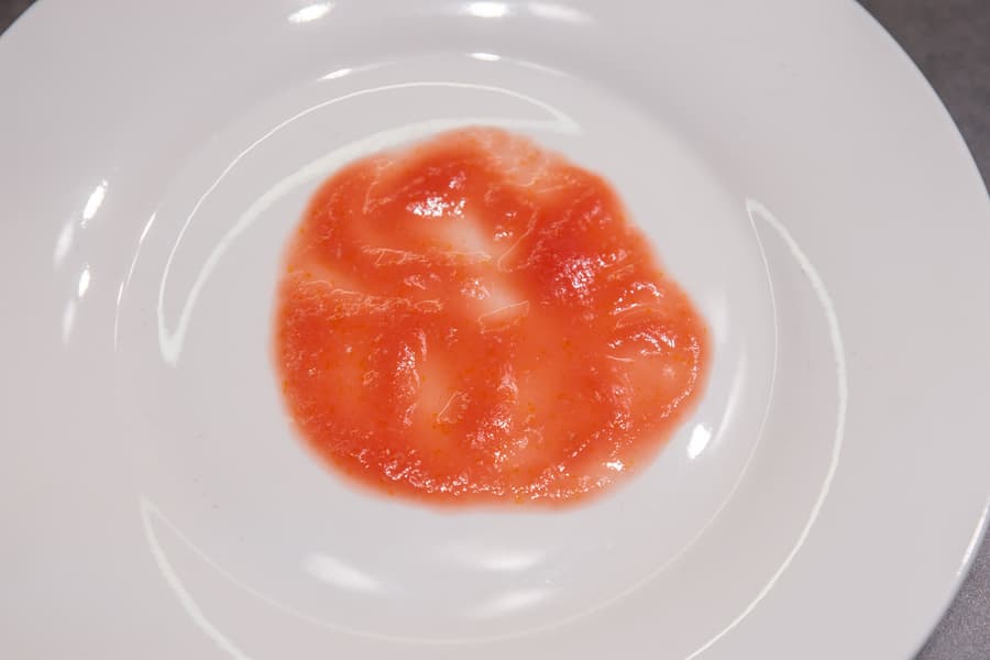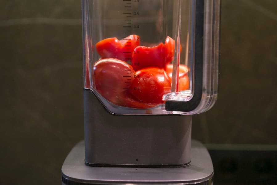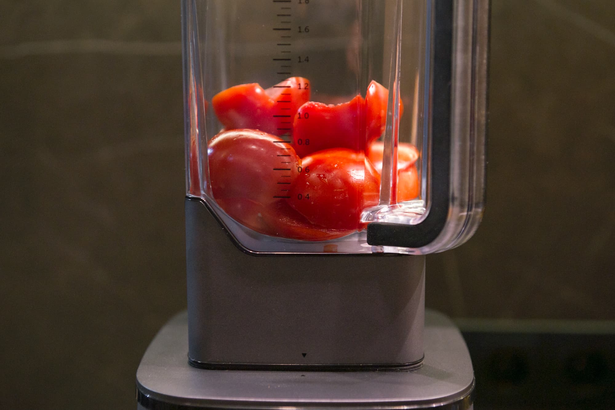 Для первого теста мы взяли 550 г томатов сорта Сливка. Разрезали каждый пополам и удалили плодоножки.