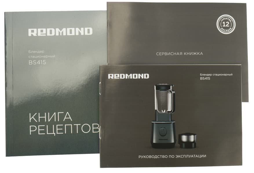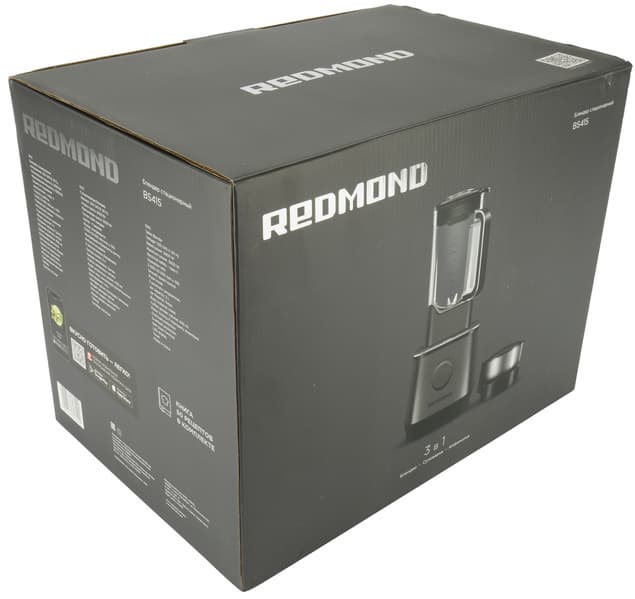 Блендер Redmond BS415 поставляется в большой красивой коробке, оформленной в фирменной стилистике бренда. На матовом фоне графитового оттенка глянцевой ламинацией выделены крупные фотографии блендера, рядом с ними размещены пиктограммы с описанием ключевых особенностей устройства, а также информация о производителе и краткие технические характеристики.