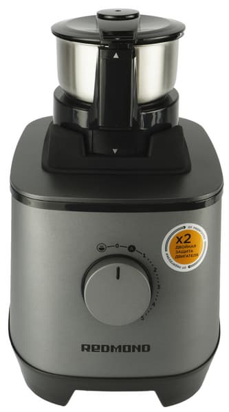 Весит устройство без малого 6 кг. В высоту Redmond BS415 потребует целых 48 см для самого прибора и порядка 30 см для манипуляций толкателем. На поверхности стола блендер держится очень устойчиво, сдвинуть его нелегко. Прочное сцепление обеспечено четырьмя крупными ножками с рифлеными резиновыми накладками.