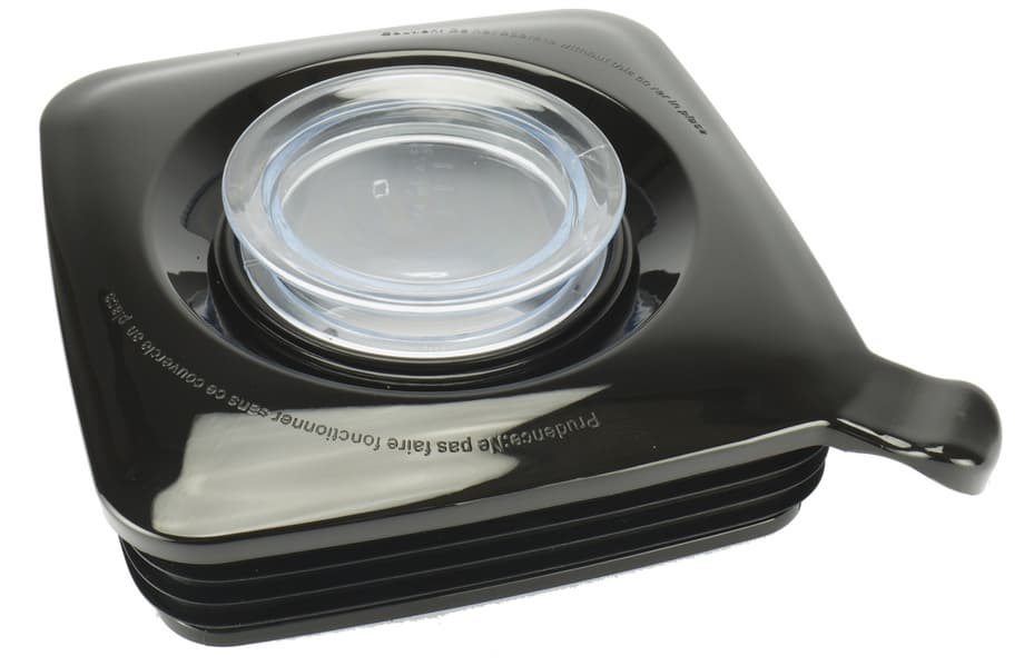 Крышка из черного глянцевого пластика прорезинена, за счет чего создает в кувшине герметичное пространство, но и снимается с очень заметным усилием. Для толкателя или добавления ингредиентов в процессе работы прибора в центре крышки есть отверстие. Оно закрывается мерным колпачком. Деталь из прозрачного пластика с отметками 35, 50 и 65 мл закрепляется в крышке поворотом по часовой стрелке.