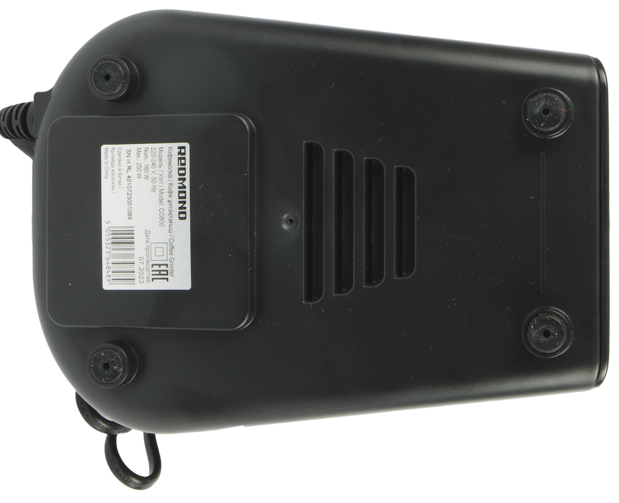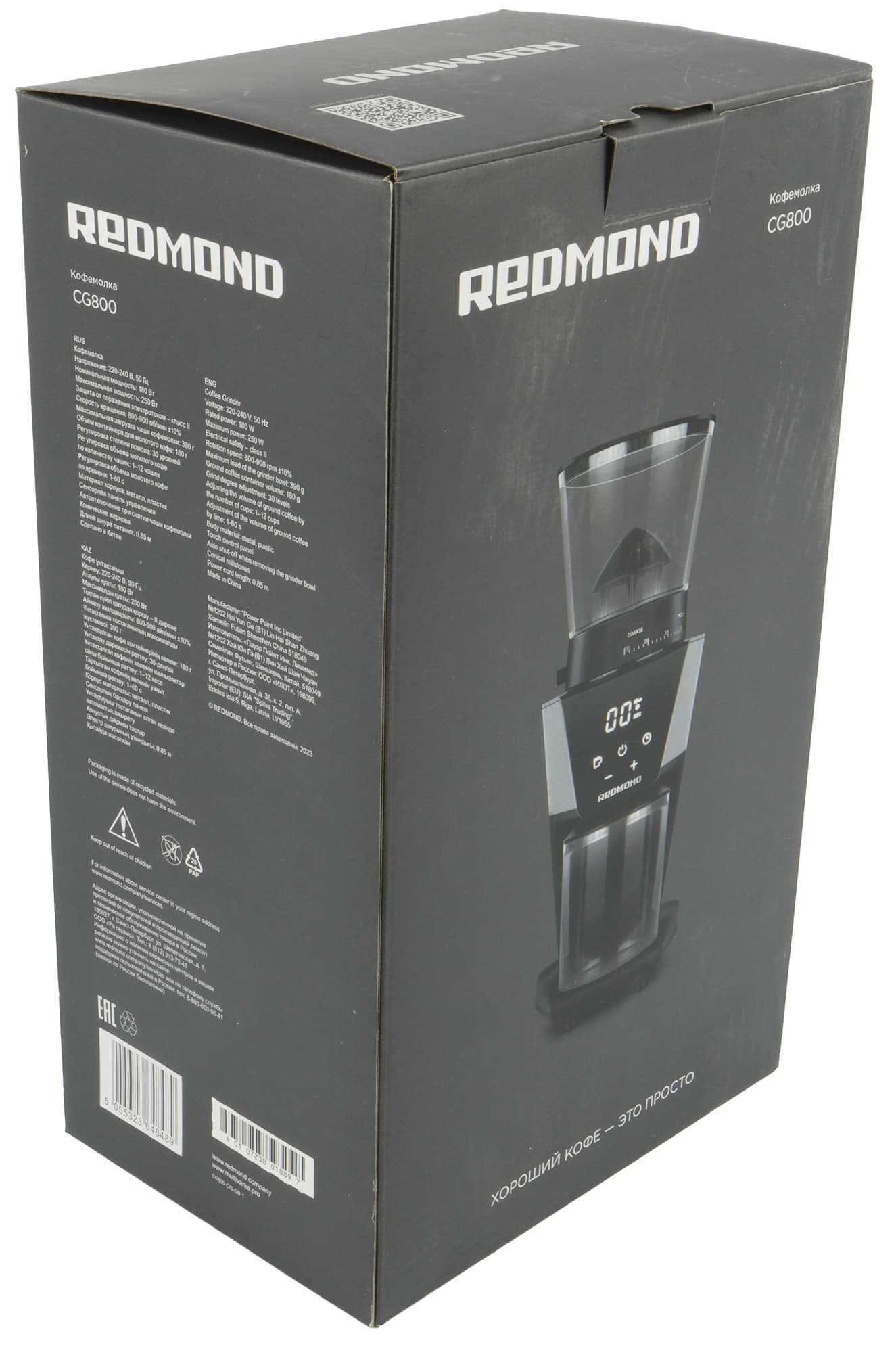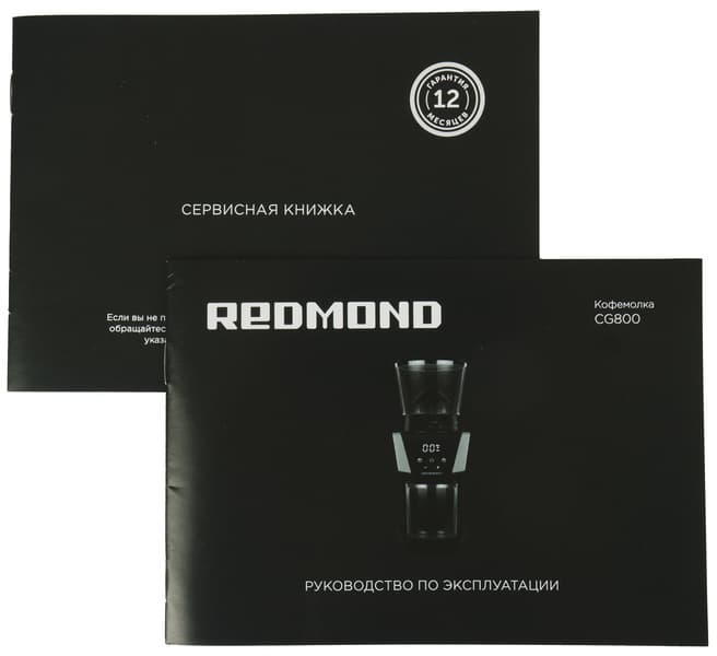 Кофемолка поставляется в картонной коробке, оформленной в фирменном стиле Redmond: строгий дизайн, серый фон, на лицевой стороне фотография устройства, по бокам — описание модели и основные технические характеристики. Внутри содержимое упаковано в полиэтиленовые пакеты и защищено от ударов с помощью вкладок из прессованного картона.