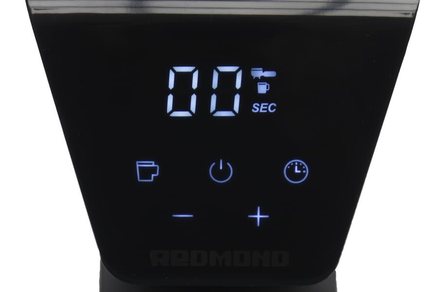 Кстати, сразу обратим внимание, что дисплей у нашей кофемолки симпатичный, знаки хорошо читаются, однако глянцевая поверхность неплохо собирает и отпечатки пальцев, и пылинки.