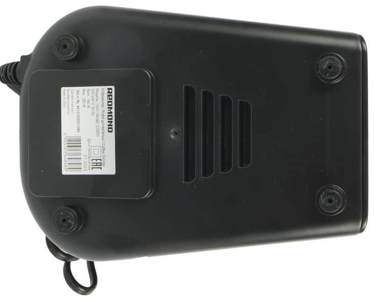 Кофемолка опирается на четыре резиновые ножки, препятствующие скольжению по гладкой поверхности.