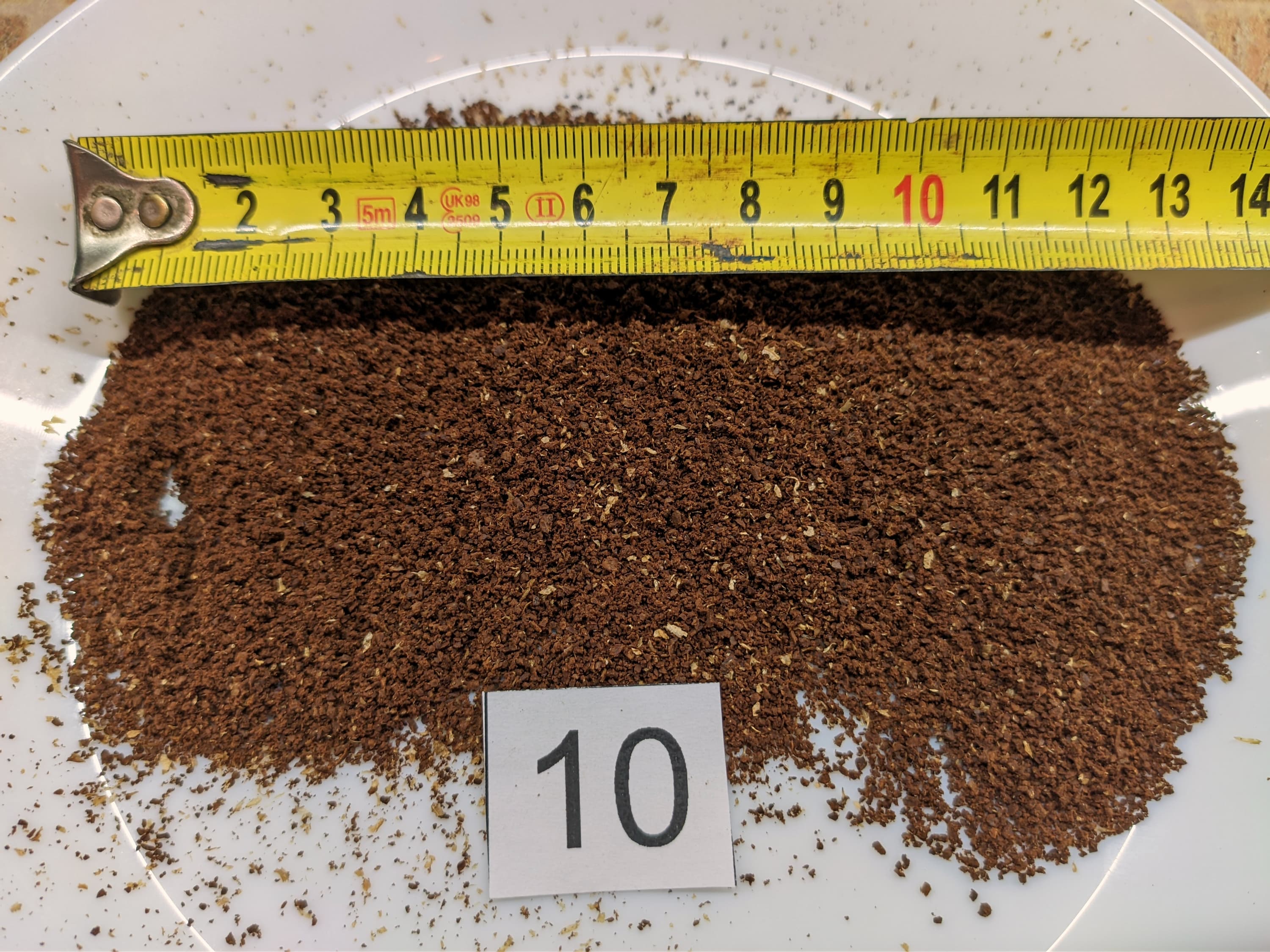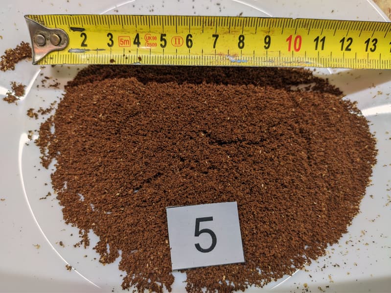 Посмотрим на помол «5». Тут мы видим кофе, помолотый для приготовления в рожке. Конечно, для получения идеального напитка, нам придется приготовить несколько чашек и выбрать наиболее подходящий помол (по нашим прикидкам — от 3 до 7 в зависимости от зерен).