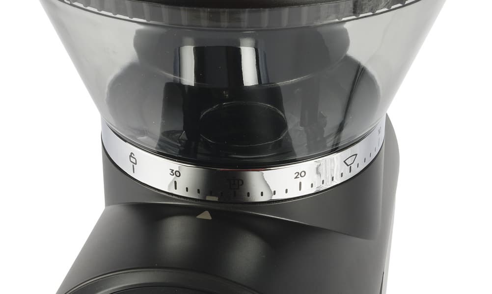 Как мы уже упоминали выше, размер помола настраивается поворотом контейнера для зерен относительно корпуса кофемолки. На нем нанесены риски от 30 (самый крупный) до 0 (самый мелкий). Переключение помола ступенчатое, поэтому особо точная регулировка нам недоступна.