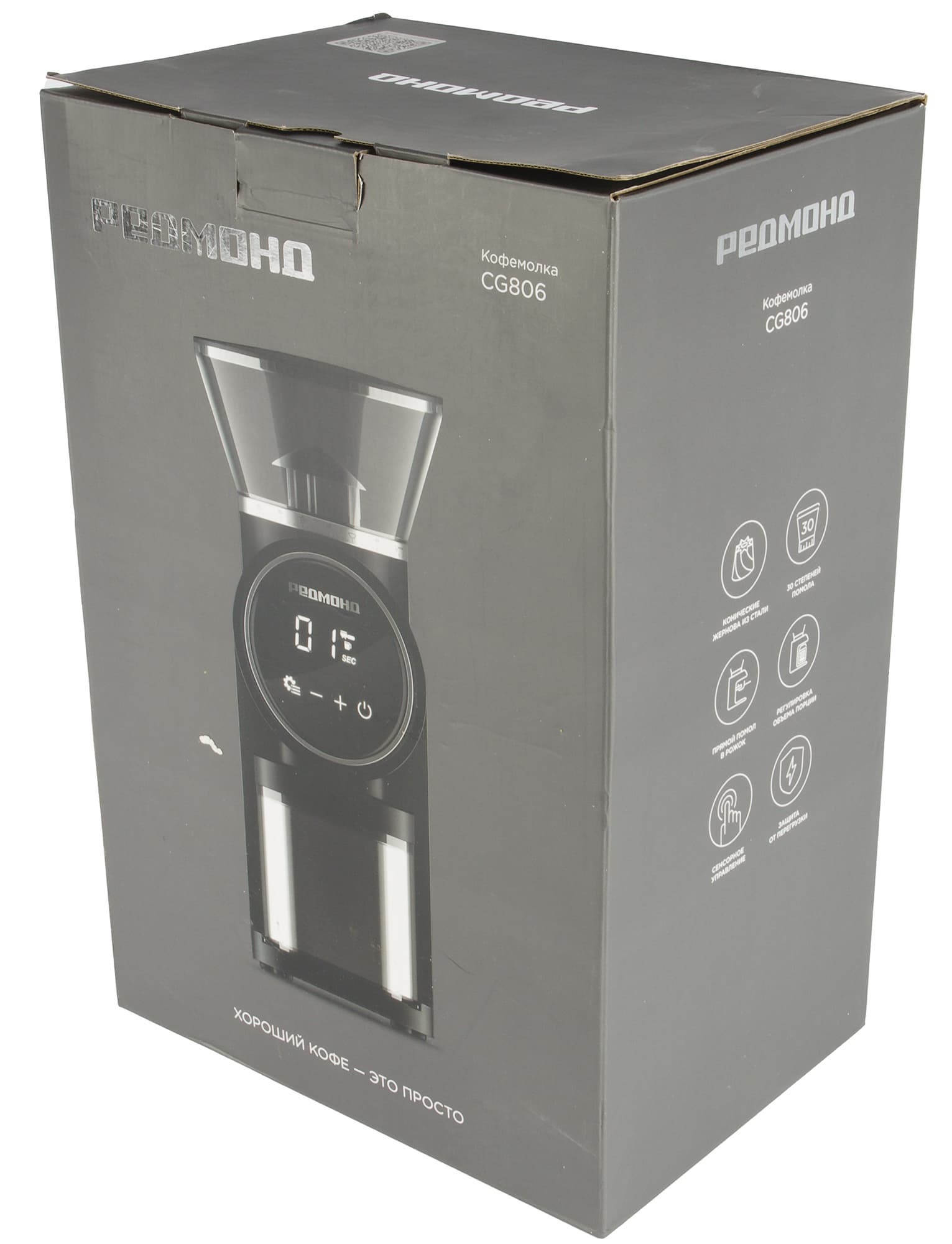 Кофемолка поставляется в картонной коробке, оформленной в фирменном стиле Redmond: строгий дизайн, серый фон, на лицевой и задней стороне фотография устройства, по бокам — описание модели и основные технические характеристики на трех языках — русском, казахском и английском. Внутри содержимое упаковано в полиэтиленовые пакеты и защищено от ударов с помощью вкладок из прессованного картона.
