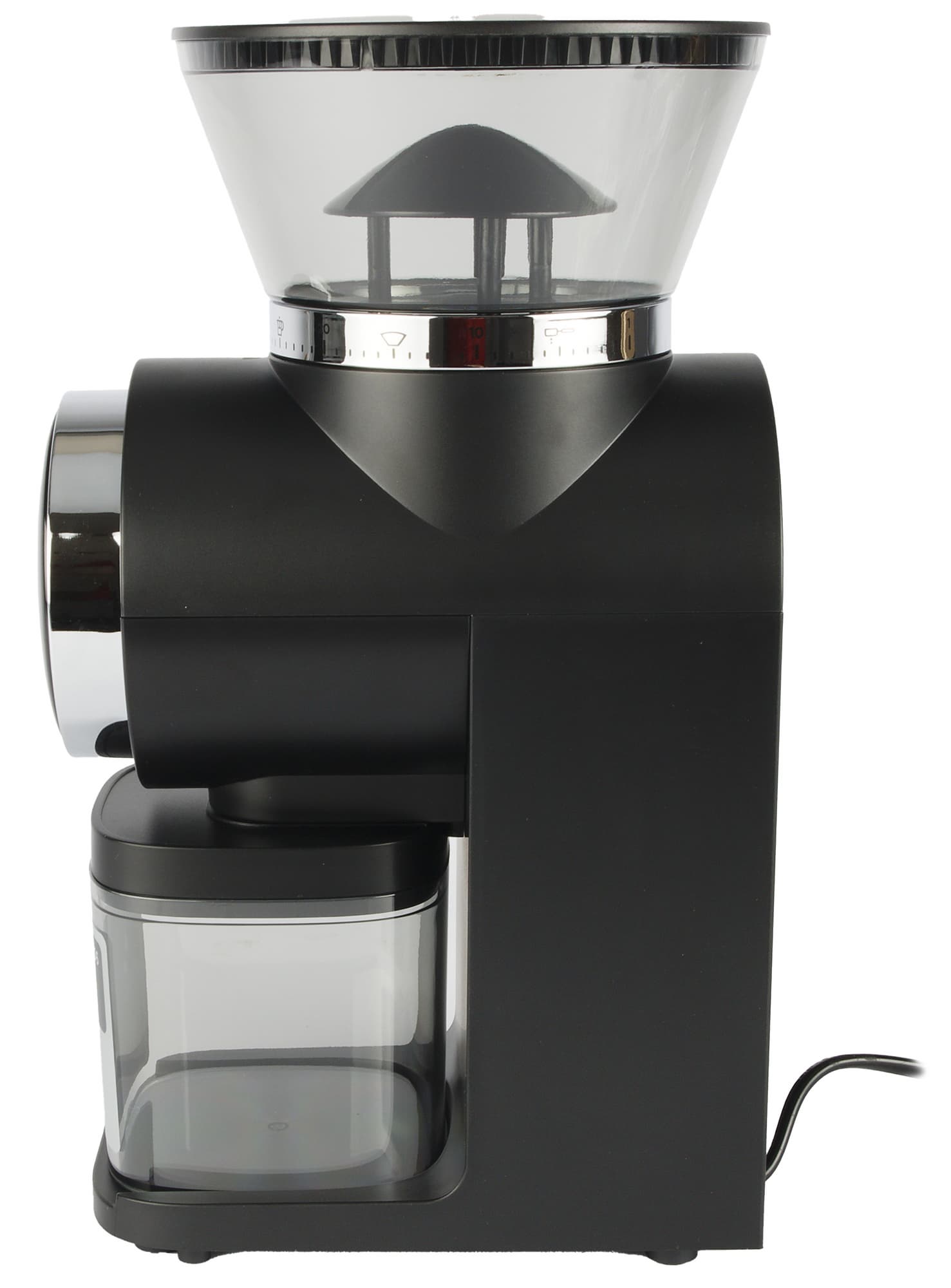 Контейнер для молотого кофе объемом 450 мл выполнен из прозрачного пластика. Крышка из черного пластика имеет отверстие по центру и выемку для фиксации на кофемолке в задней части. Пробки или сплошной крышки не предусмотрено, так что долго хранить молотый кофе в контейнере не стоит: если вы собираетесь намолоть зерен с запасом, следует пересыпать молотый кофе в другую емкость.