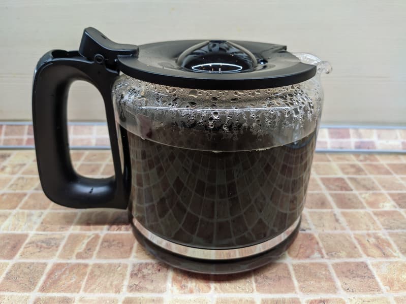 Первые капли начали поступать в кувшин примерно через полторы минуты, а полный пролив воды был завершен через 14 минут и 16 секунд после начала приготовления. Еще немного напитка осталось внутри фильтра и вытекало единичными каплями. Кофеварка перешла в режим подогрева через 14 минут и 40 секунд после начала приготовления.