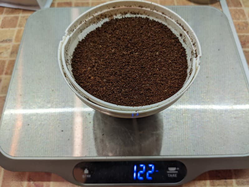 Для начала оценим, как будет смотреться полная порция кофе в фильтре. Мы воспользовались пропорцией 60 г кофе на литр воды и засыпали в кофемолку примерно 120 г кофе, что соответствует объему 1,8 литра. Подобрали подходящий помол и смололи свежеобжаренные зерна.