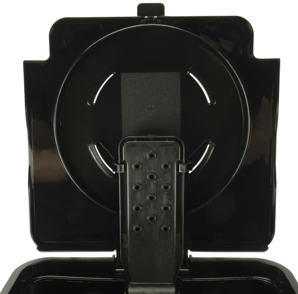 Кофе подается через центральное отверстие, расположенное в верхней части выгнутой полусферы. Если отдельные капли попадут мимо — не страшно. В углублении есть второе отверстие на такой случай, так что весь напиток в результате окажется внутри кувшина. Пластиковая крышка легко открывается при нажатии на рычаг, расположенный ровно под большим пальцем.