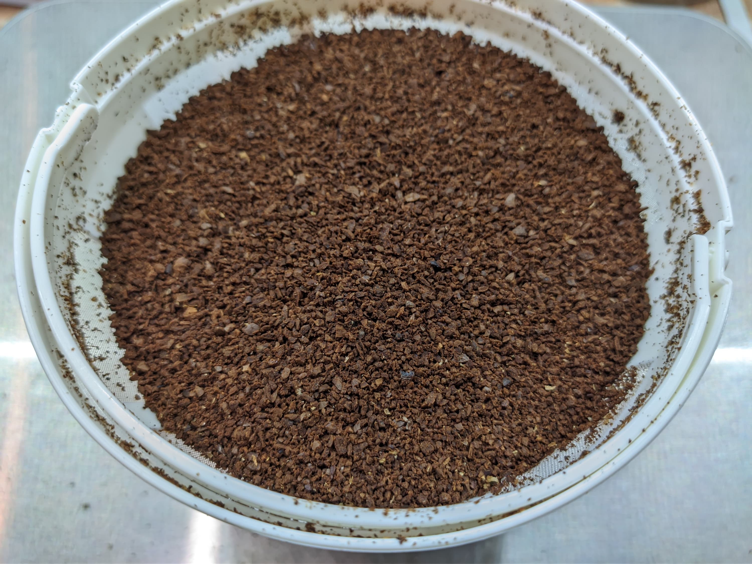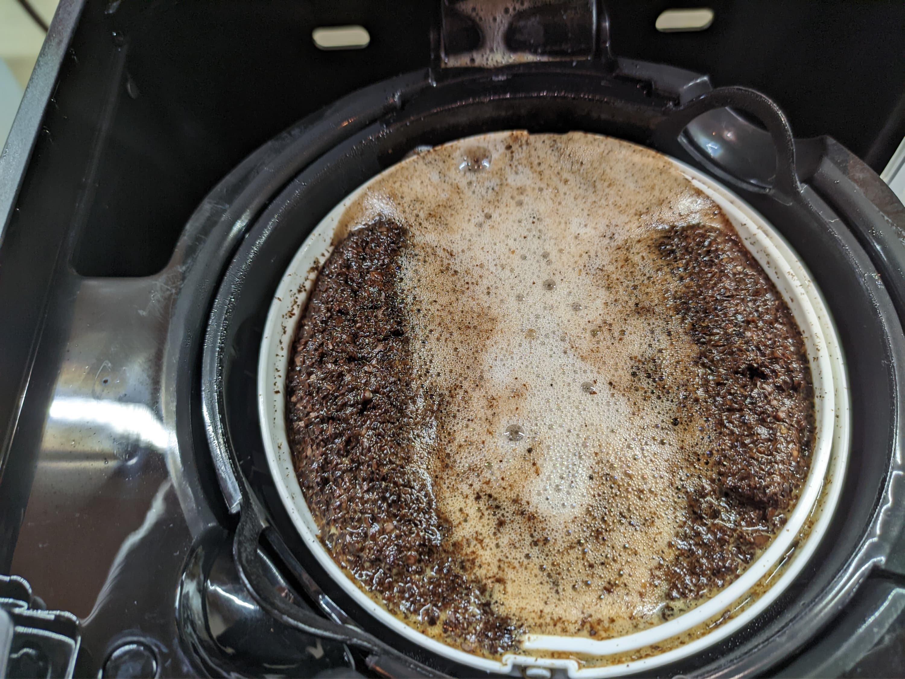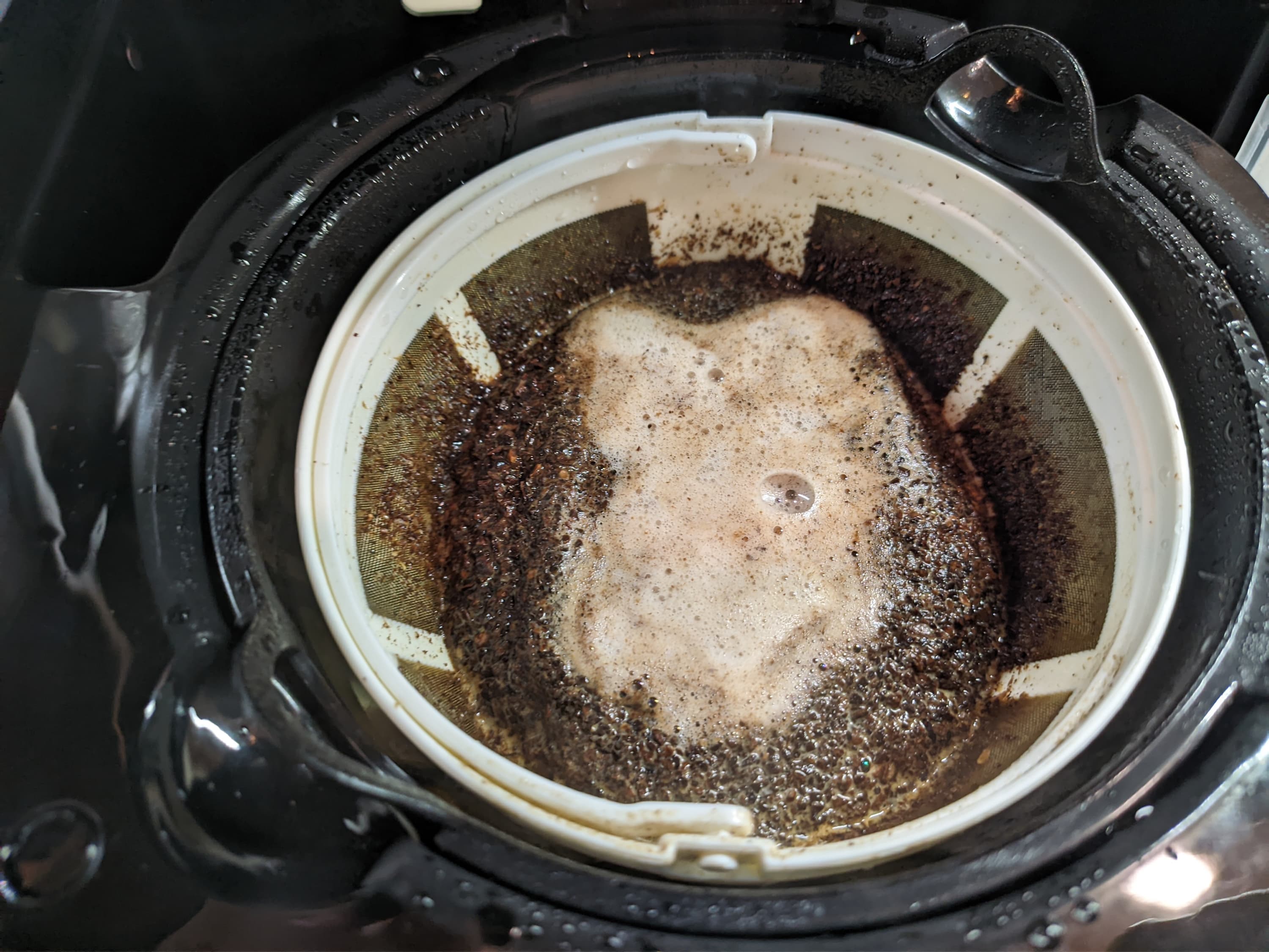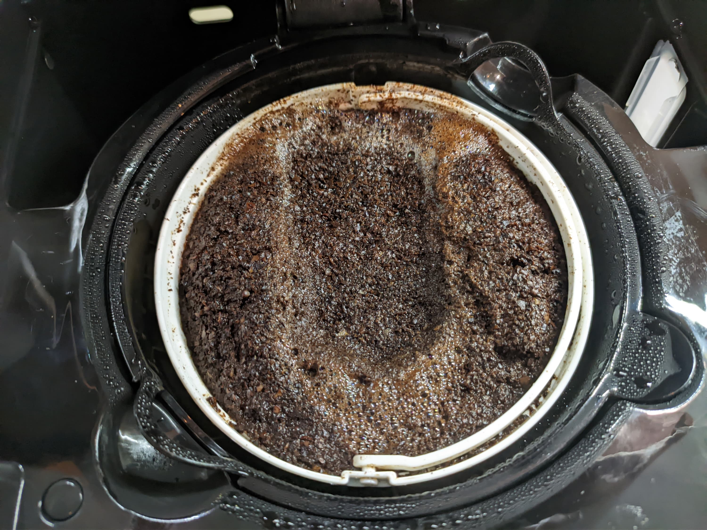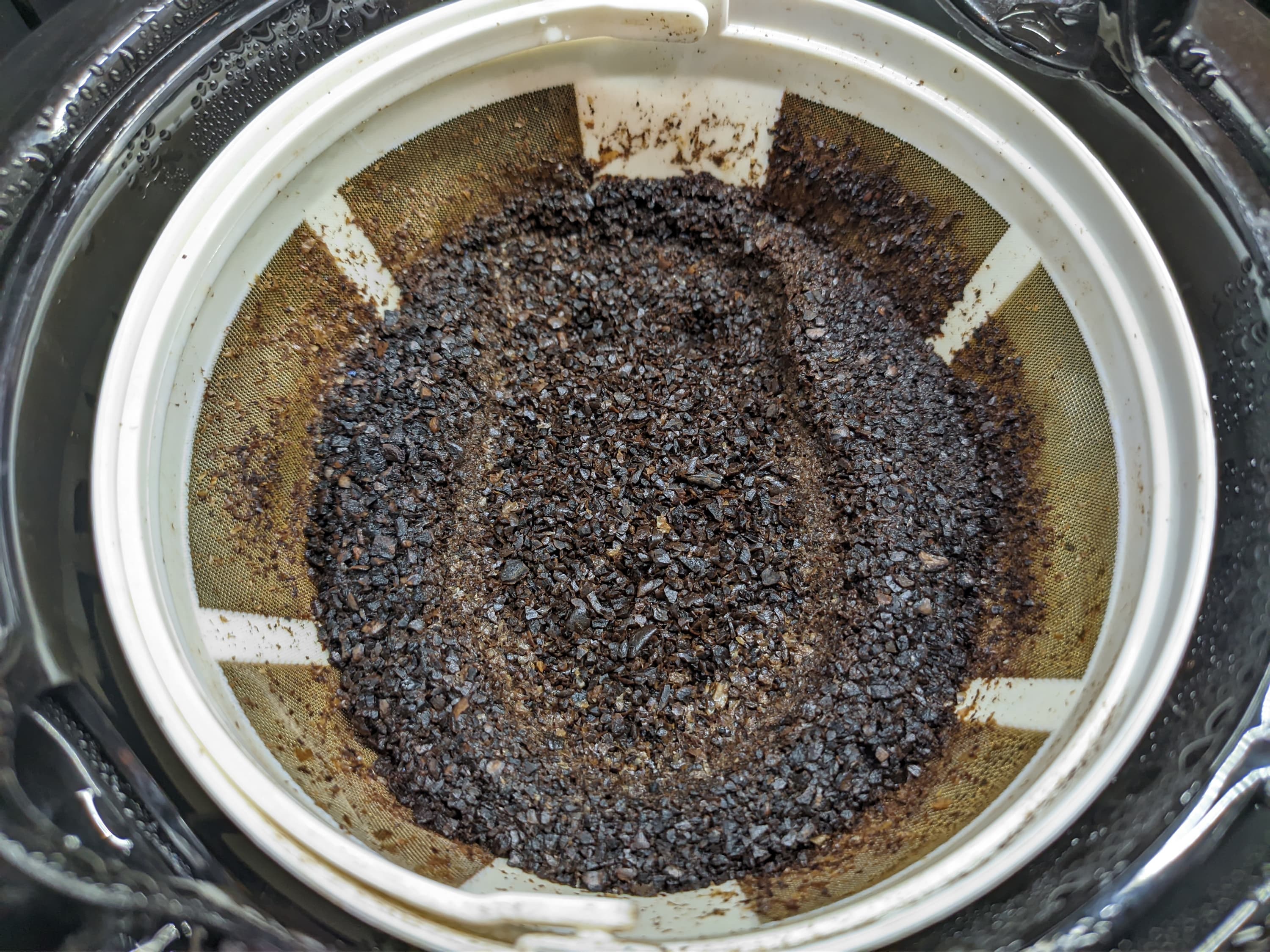 Увы, чуда не случилось: на отработанном кофе мы видим четкий след: именно сюда попадает горячая вода. Остальные зоны получают уже слегка остывшую воду, что не лучшим образом сказывается на качестве заваривания.