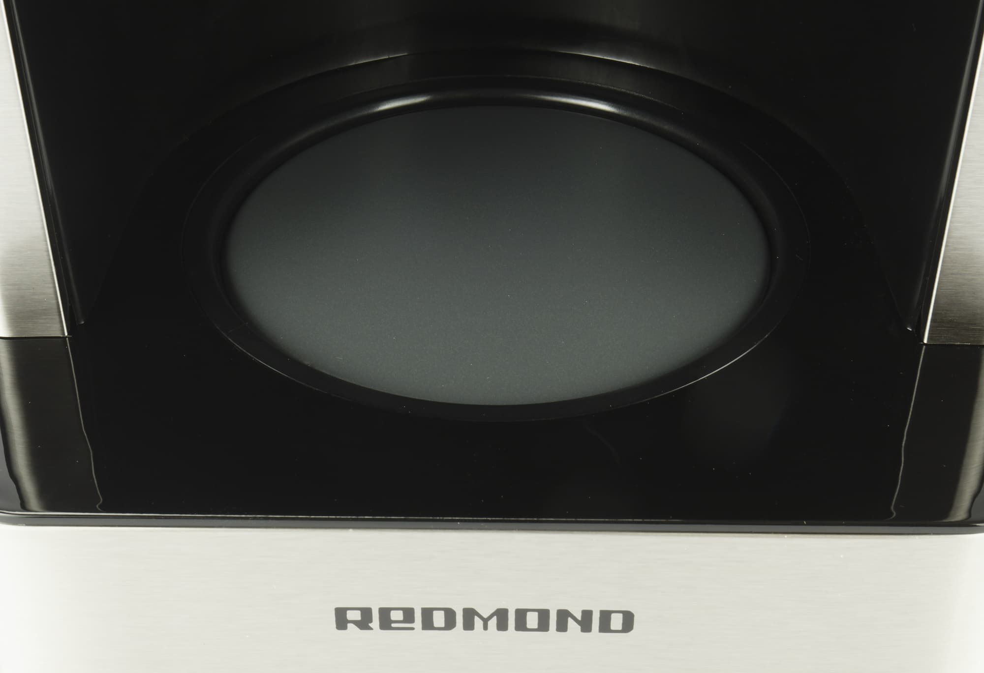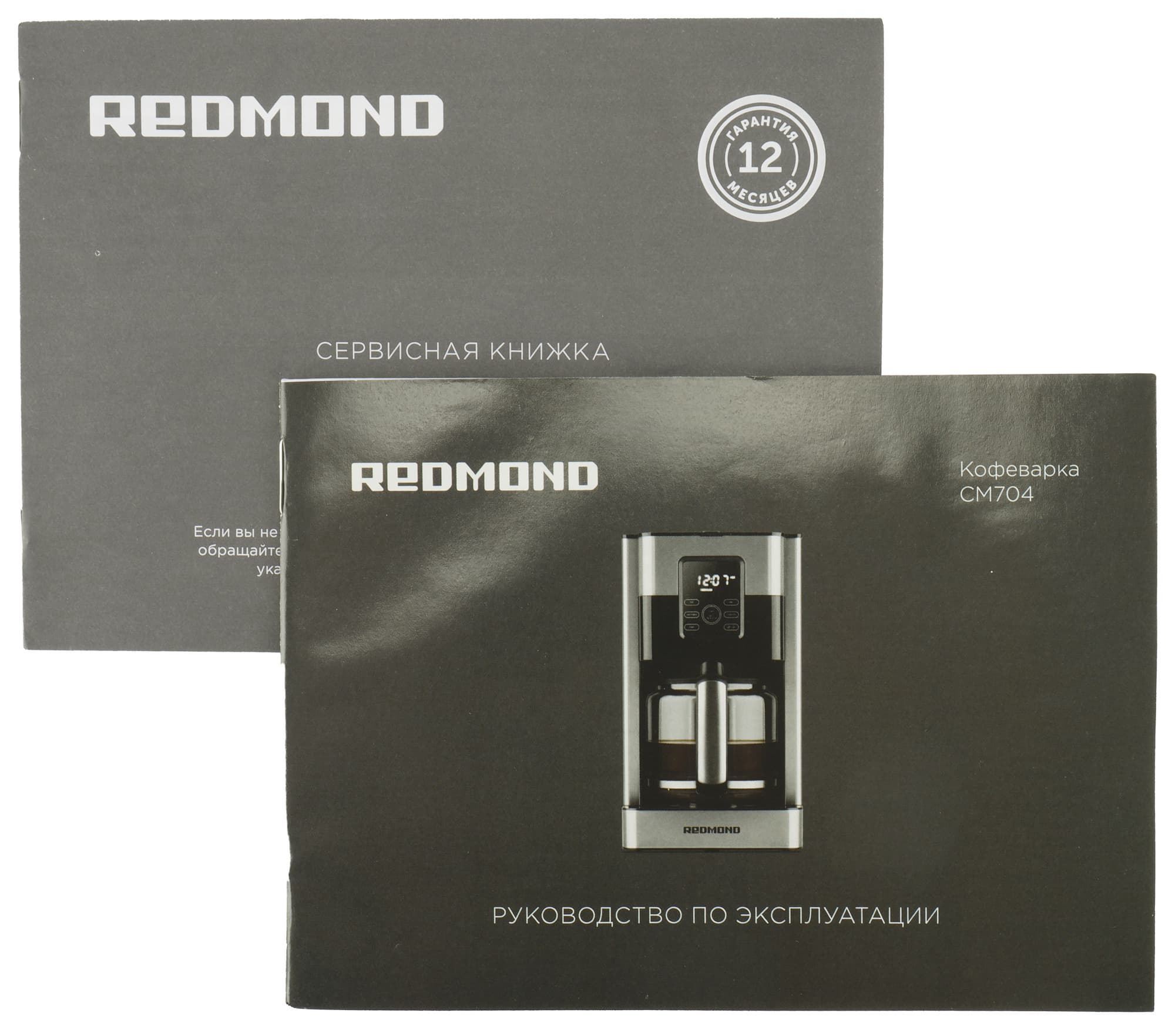 Кофеварка поставляется в стильной картонной коробке, оформленной в фирменном стиле Redmond. Некоторое время назад упаковка приборов, выпущенных под этим брендом, изменилась в сторону строгого дизайна. Цвет фона — серый. На нем выгодно и серьезно смотрится фотография прибора. По бокам — информация о модели и технические характеристики.